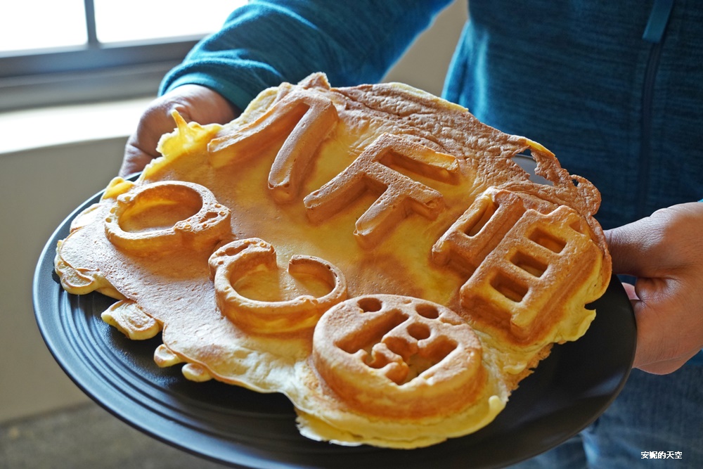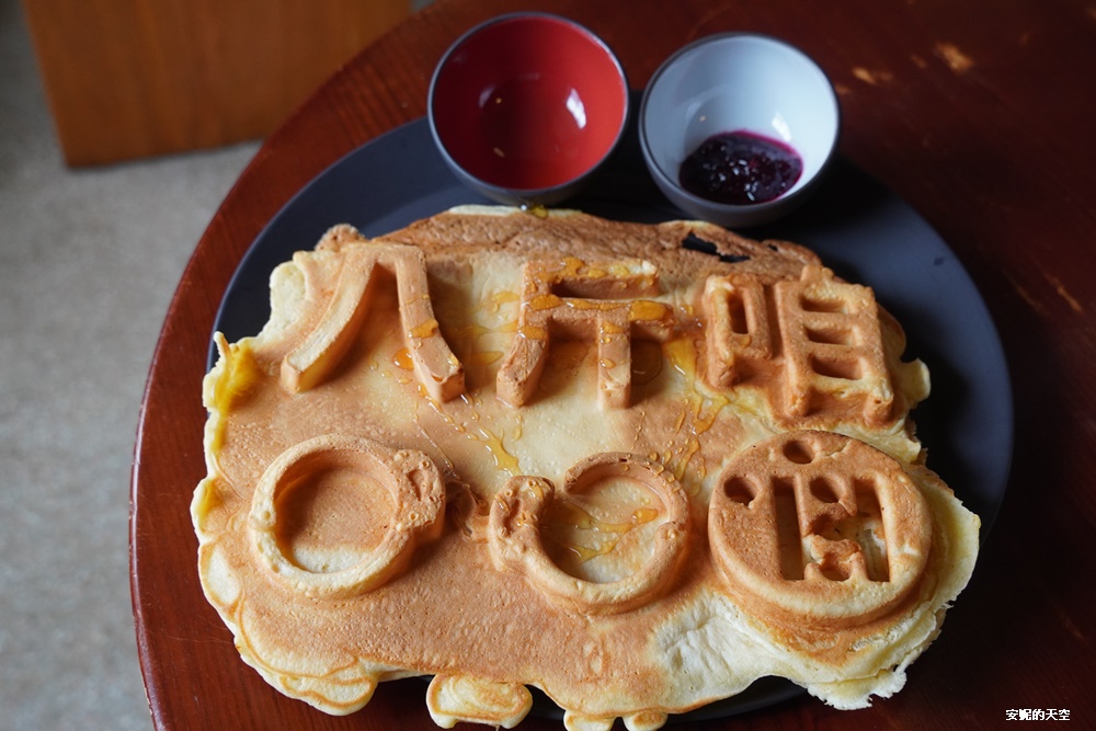 這很像是巨型的雞蛋糕,還有脆脆的邊邊,上面的壓模印有手銬與八斤的字樣,將古蹟與咖啡館的特色交融在瓦福中,相當有特色。