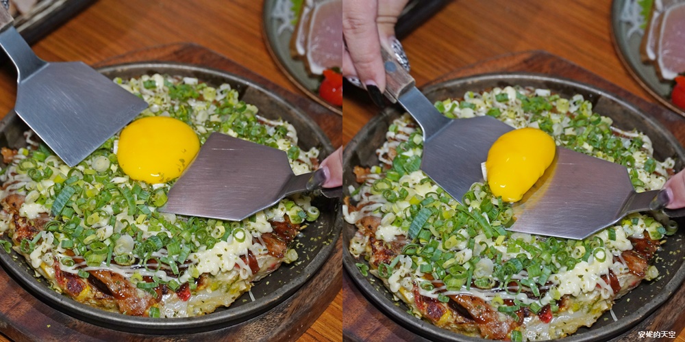 這道大阪燒的正宗吃法,是將那顆還能拌生的蛋黃,用小湯鏟輕輕打散,淋在熱騰騰的大阪燒上,讓蛋液與起司交融,再切塊分食,從第一口就能感受到層層堆疊的濃郁滋味。