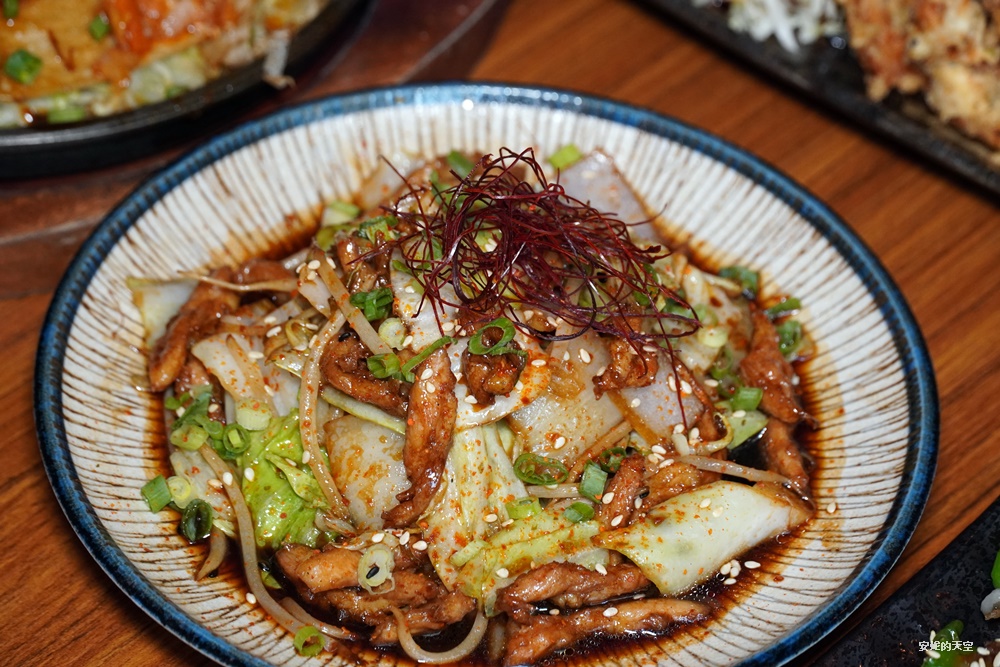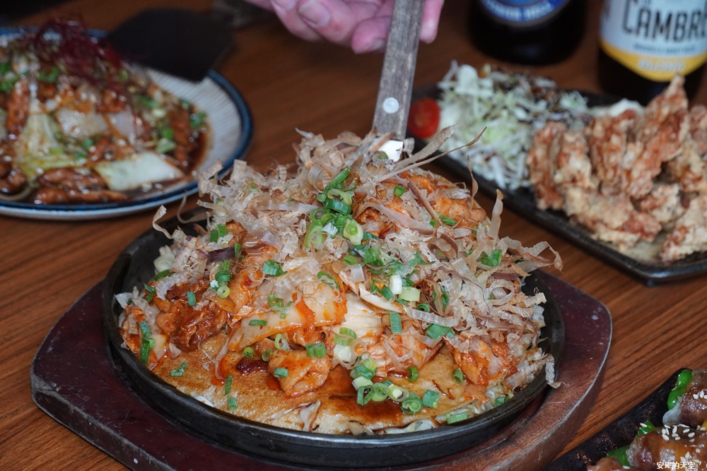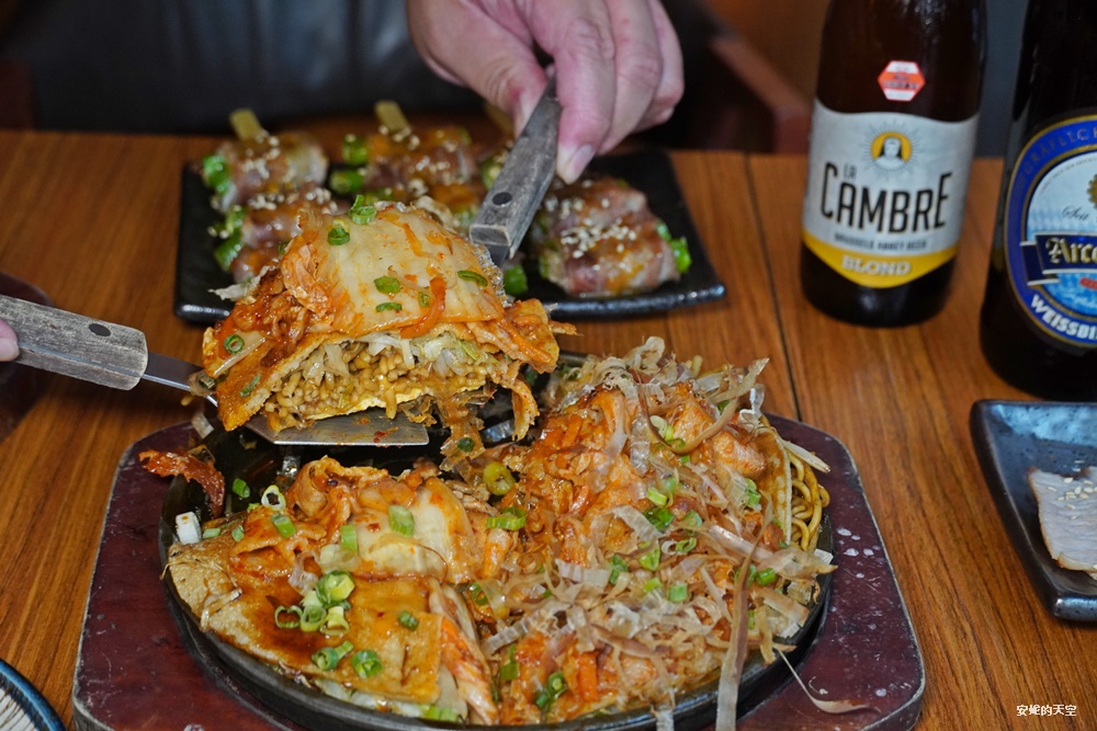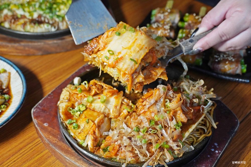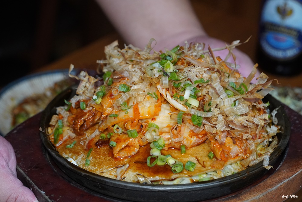 熱氣蒸騰中,柴魚片隨著熱度輕舞飛揚,畫面療癒,香氣更是誘人。結合日式煎餅的濃郁醬香與韓式泡菜的微辣爽口,這道料理可說是日韓風味的完美結合,喜歡重口味或鐵板料理的人絕對不能錯過!