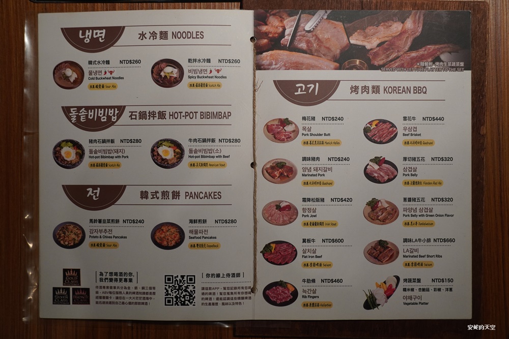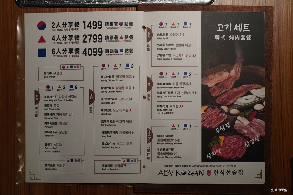 ABV韓式餐酒館的整體氛圍讓人一進門就好喜歡~整體以新穎明亮的風格為主,木質調裝飾點綴在牆面上,帶著一點韓式優雅的古典美感,溫暖又有質感✨。因為主打韓式燒肉,每張桌上都設有抽風系統,不僅烤肉香氣撲鼻,環境卻依然乾淨清爽!👍 即使是現場燒烤,也完全不會被油煙包圍,用完餐回家衣服上沒有一點油煙味,這點真的超加分!💯