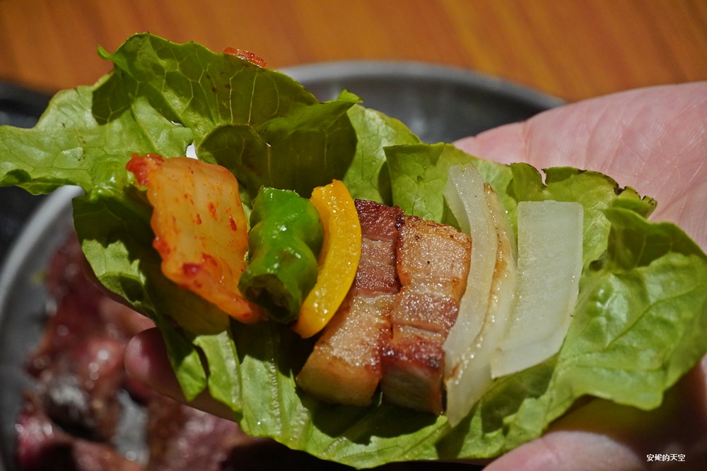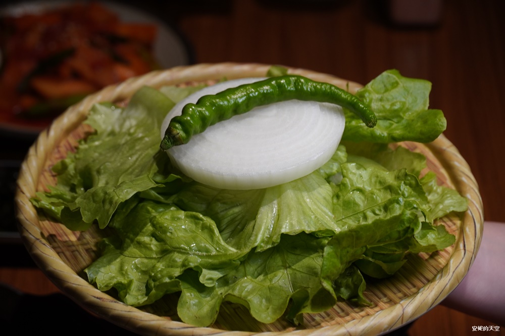 ABV韓式餐酒館包肉的生菜都是無限續加,將燒肉搭配洋蔥以及泡菜包裹生菜一起大口吃,真的是絕配。
