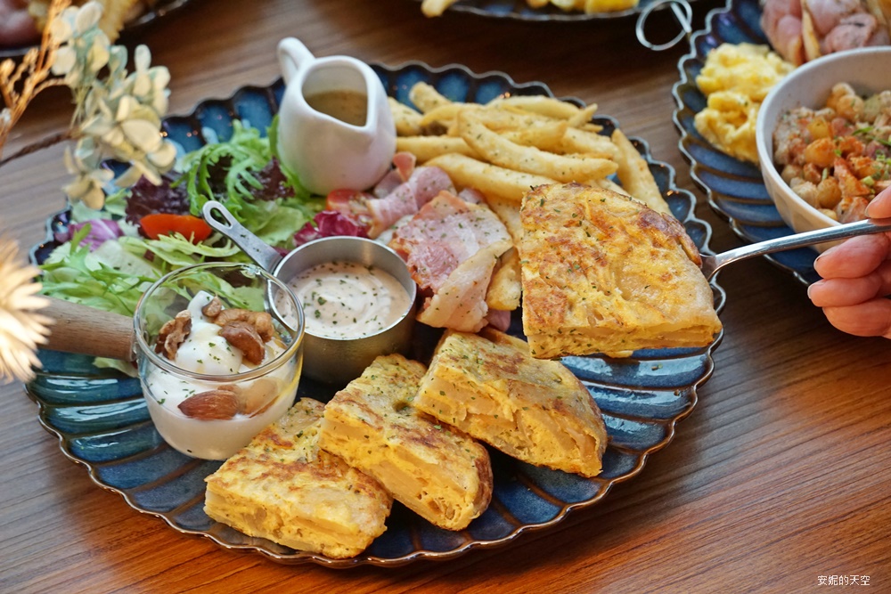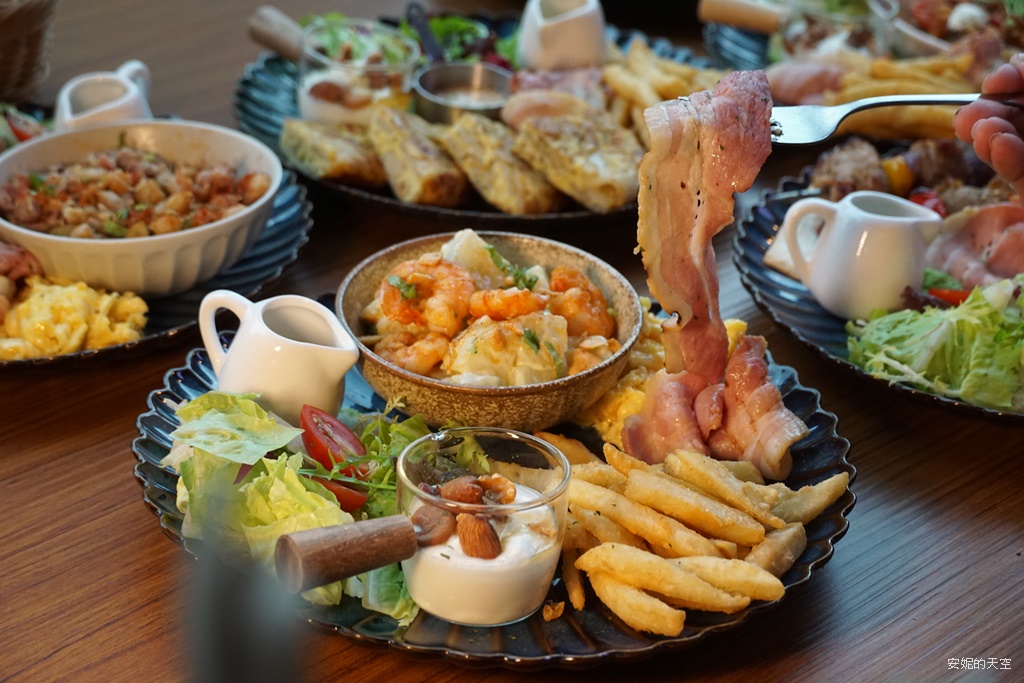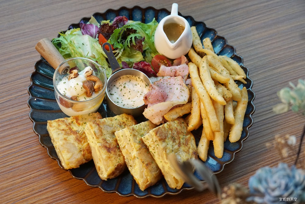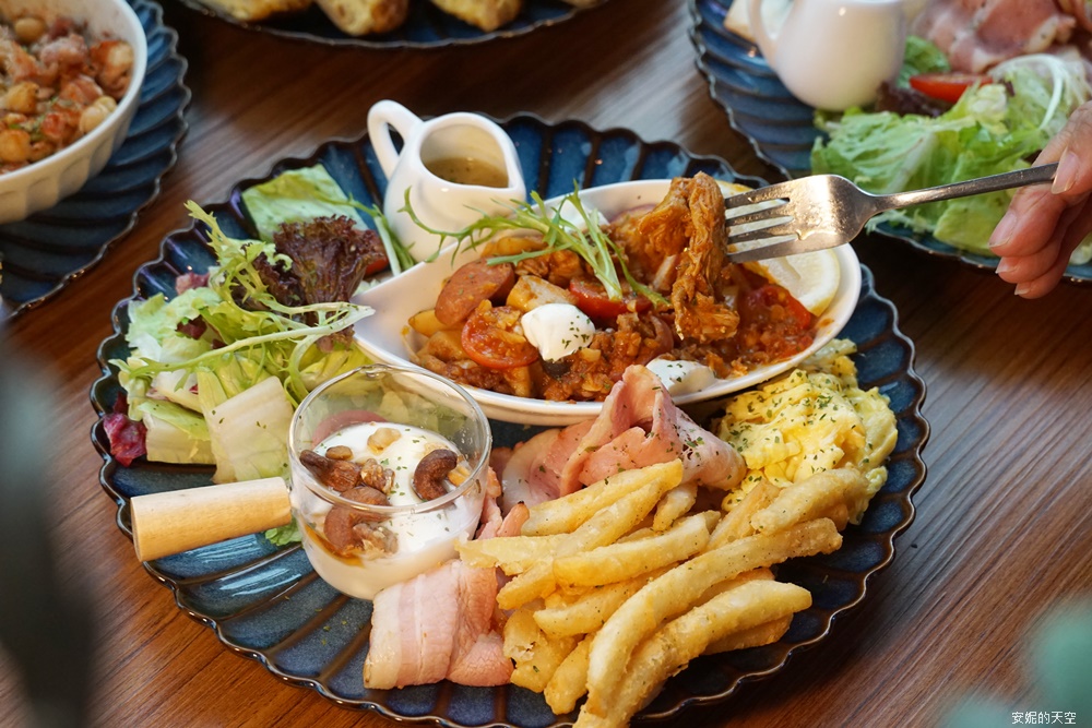 這道早午餐搭配了金黃酥脆的薯條、超大條的香煎培根、新鮮生菜搭配清爽的橄欖油醋醬,以及滑順的堅果優格,一整套早午餐讓人吃得好滿足。
