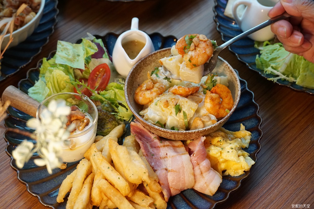 這道早午餐的主食我非常喜歡,是涼拌馬鈴薯搭配爆炒鮮蝦,並加入香脆的大蒜片提味。整體口感濃郁又不厚重,馬鈴薯的綿密與鮮蝦的鮮脆海味完美交融。這道料理清爽又營養,也很適合減脂期的朋友享用。