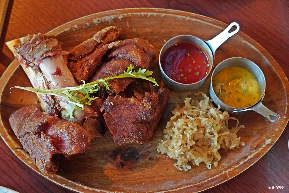 這道德國豬腳搭配了黃芥末、番茄醬以及德國酸菜,三種搭配豐富了豬腳的層次。