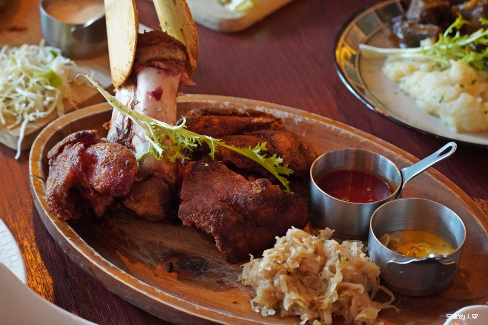 這道德國豬腳是我這天最愛的一道菜,厚實的豬腳吃起來是外脆內嫩,是一道功夫菜,也是很適合搭配酒款的下酒菜,豬腳先滷再烘烤,搭配酸高麗菜超級對味。