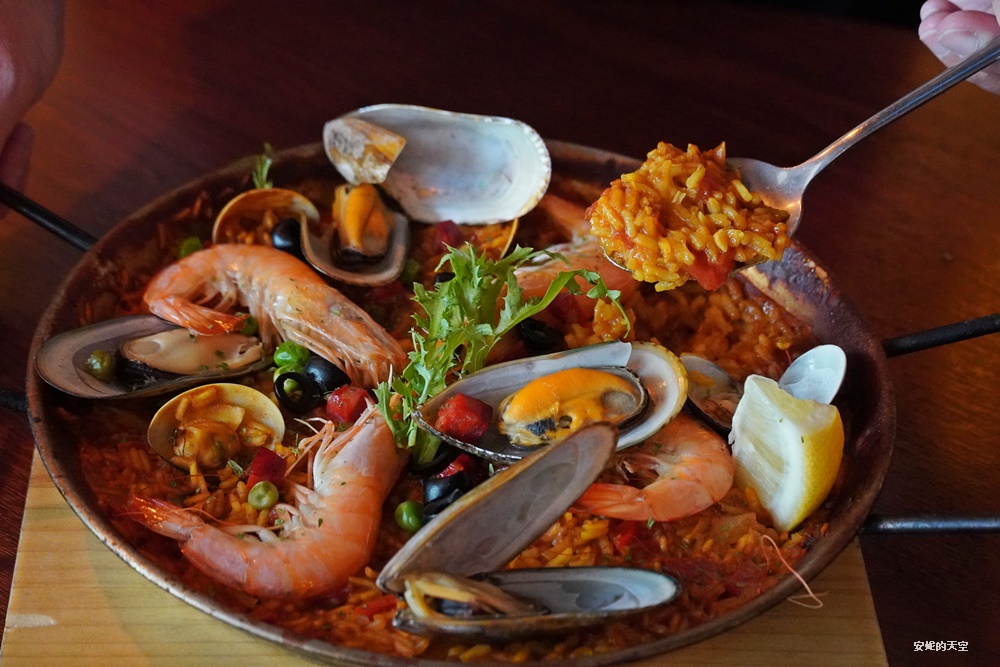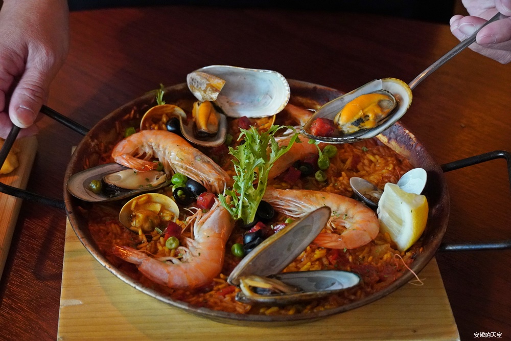 ABV的西班牙海鮮鍋飯有滿滿的海鮮配料:鮮蝦、淡菜、蛤蠣,以及洋蔥、菇類,燉飯用蝦湯與生米熬煮,所以米飯有濃郁的鮮蝦味道,這道豐富的西班牙鍋飯用鐵盤盛裝,保持鍋飯的熱度,上桌時香氣撲鼻,每一口都能吃到海鮮的鮮甜與米飯吸收湯汁後的濃郁滋味。鍋巴微微酥脆,為整道料理增添層次感,不只滿足味蕾,也讓人感受到西班牙料理的熱情奔放。
