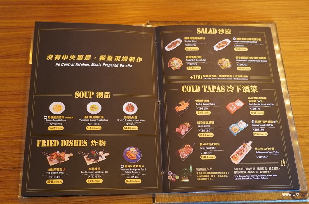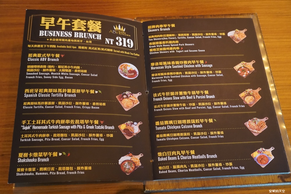 ABV地中海餐酒館台中概念店 中午就開始營業,從早午餐、PIZZA、西班牙鍋飯、炸物、沙拉、 TAPAS下酒菜應有盡有。