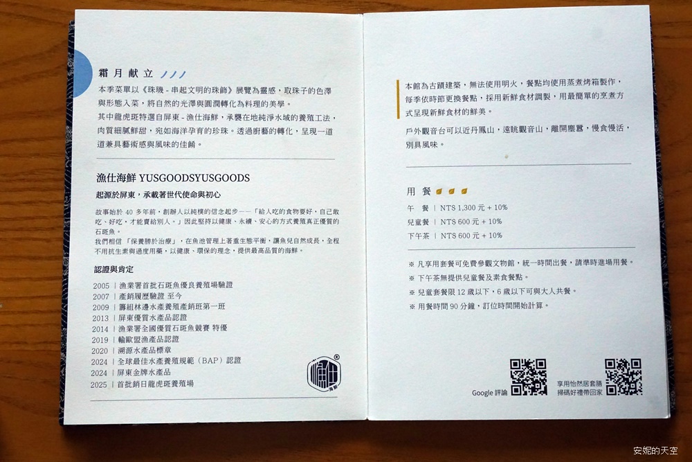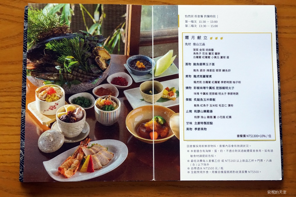 怡然居每一季都有不同的套餐組合,這一季為霜月献立,有先付、蓋物、煮物、燒物、御飯、止梚、甘味與果物,共8道餐點。