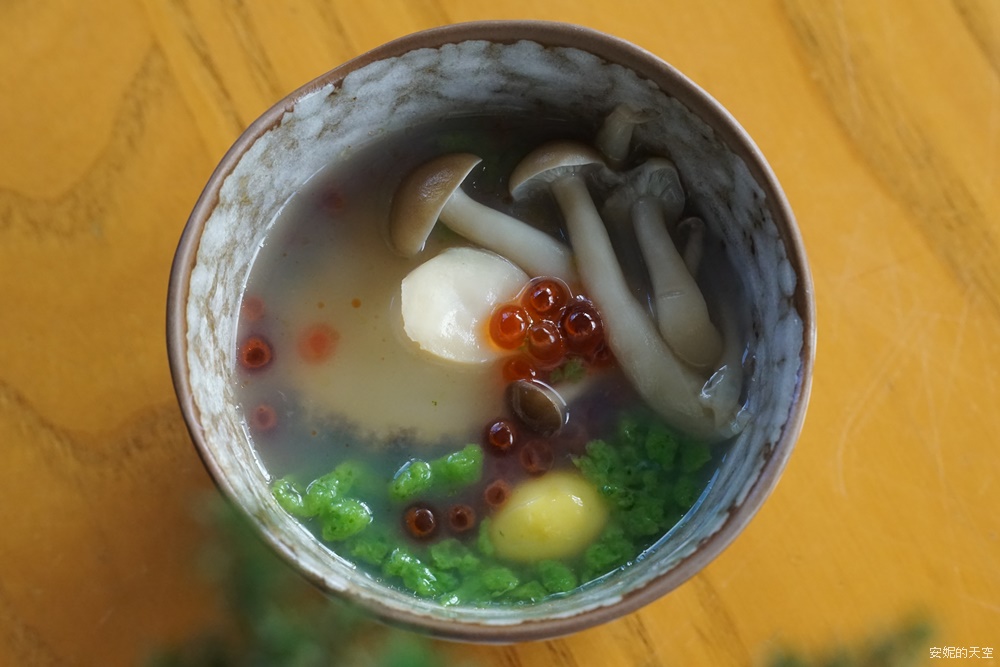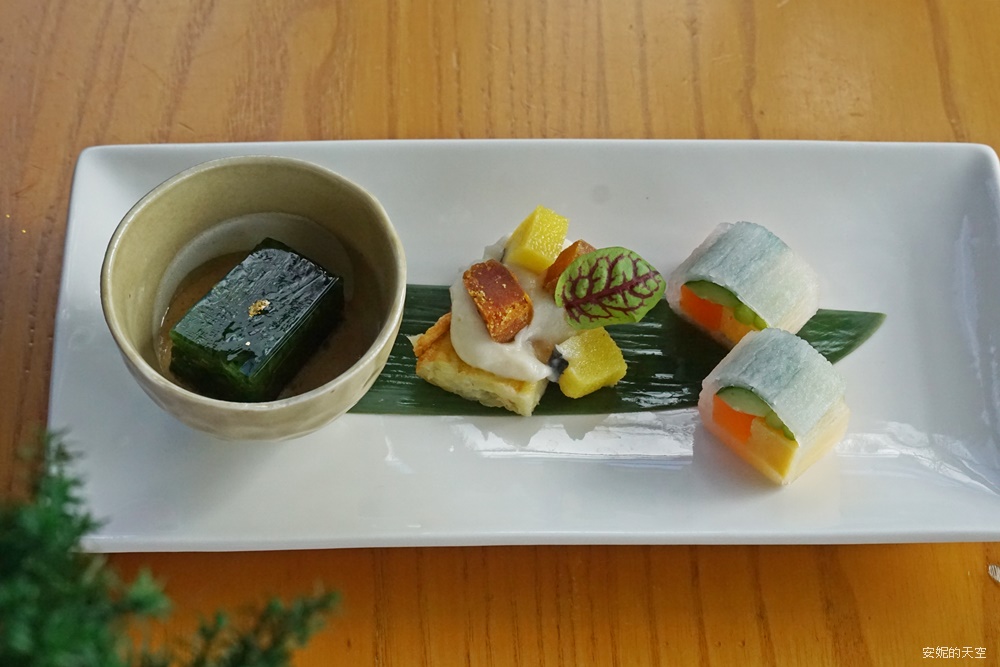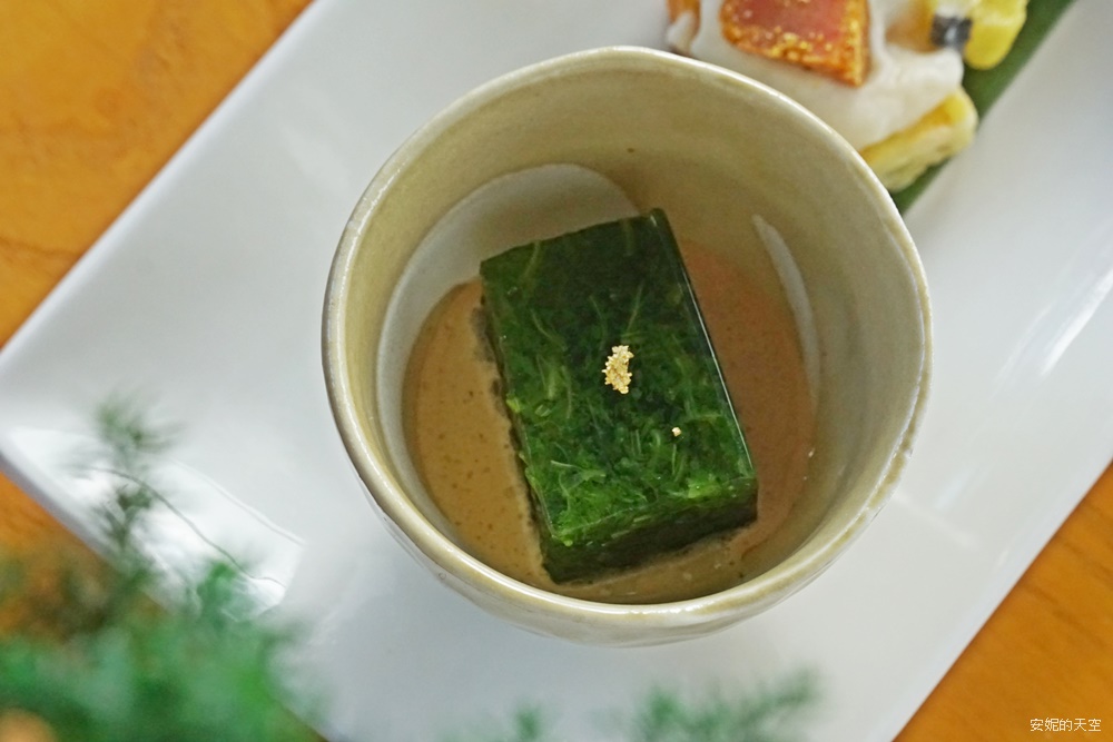 這道將菠菜做成果凍,透明的綠色與金箔交織,很有高級感,光是吃這塊菠菜果凍就讓我大為驚艷,Q彈口感吃不到菜味,交融胡麻醬更是讓味覺多了一個層次,不管是視覺上或是味覺上,都是相當出色的表現。