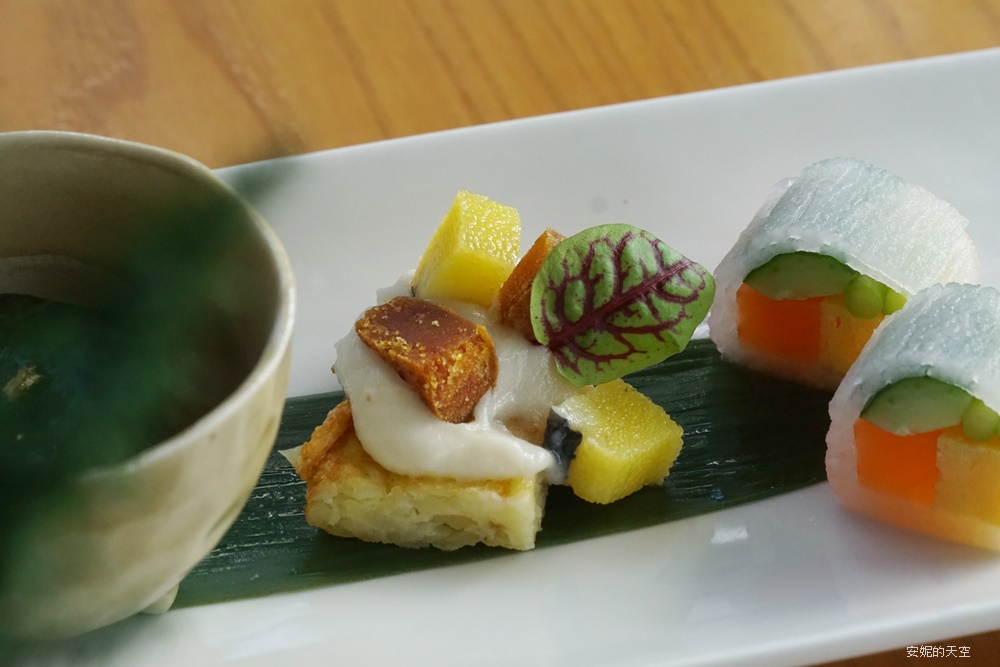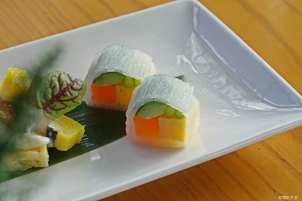 這道用白蘿蔔包裹多樣蔬菜的前菜相當脆口清爽,滿嘴都是蔬菜甜氣與蛋的香氣,可以感受這道料理的刀工與巧思,顏色搭配也相當的可口。