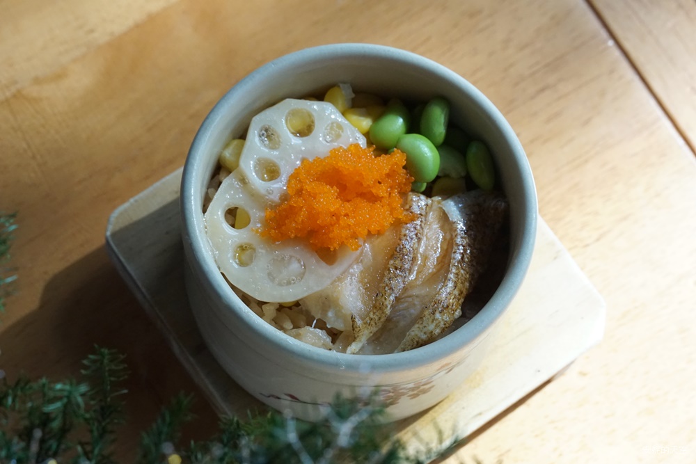 底下以鮭魚蒸煮的燉飯也很精彩,裡頭加入毛豆與玉米,增添咀嚼口感。燉飯本身帶著濃郁的魚鮮味,吃起來香氣十足,令人意猶未盡。
