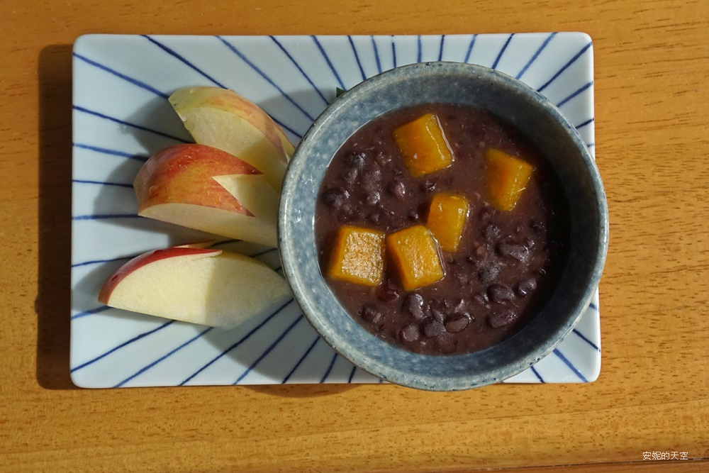 最後的甜點與水果是紅豆番薯湯搭配蘋果。甜湯非常好喝,紅豆與番薯都煮得綿密入味,不過我覺得如果能改成特色蛋糕會更出色,否則滿滿的澱粉吃到最後會有點飽足感過重。