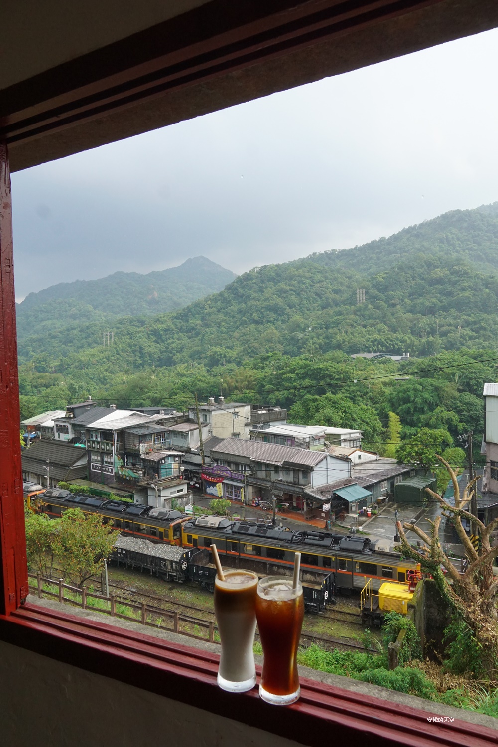 從屋內俯瞰菁桐小鎮,此時的火車剛好停駐,讓火車迷的我驚呼太美了,也許是對火車鐵道的狂愛,才讓我對這裡有這樣深的迷戀。