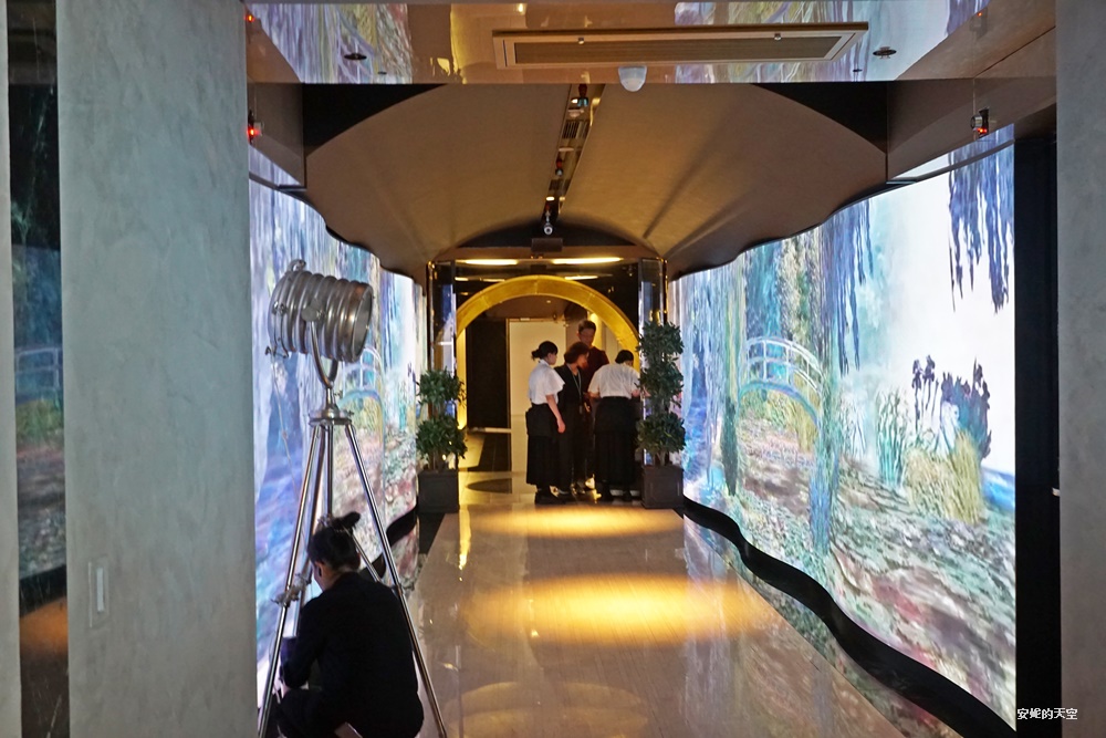 【隨意鳥地方】位於台北101大樓的85樓,一踏出電梯,走進餐廳前,會經過一條充滿藝術氛圍的通道。兩側牆面透過光影變化,輪番呈現各種不同的影像,有時是台灣的金黃稻田,有時是搖曳生姿的紅酒畫面,最令我驚豔的,是那一幅幅宛如莫內筆下的印象派畫作。