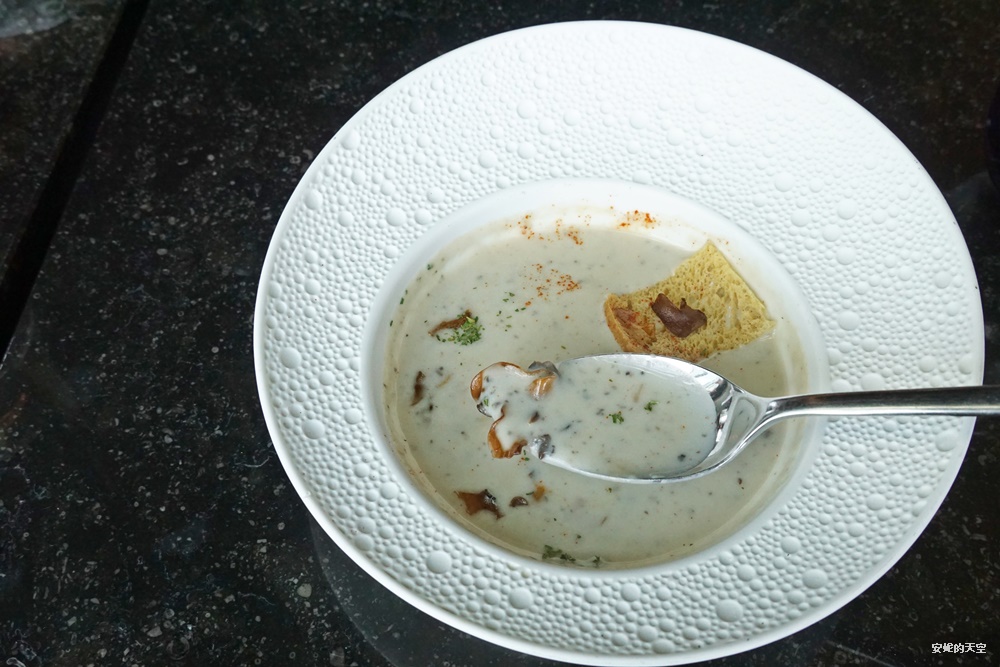 安妮這次選擇的湯品是搭配蘑菇碎的松露濃湯,一上桌便飄來濃郁迷人的香氣。湯品本身醇厚濃稠,松露與蘑菇的氣息在舌尖交融,每一口都能感受到食材的層次與深度。
