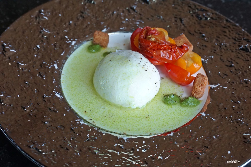 前菜部分,安妮這次選擇的是布拉塔起司佐開心果青醬。柔滑濃香的布拉塔起司與帶有堅果香氣的開心果青醬完美交融,風味層次豐富卻不搶味。上頭點綴著油封番茄與酥脆麵包塊,不僅口感更加立體,也讓整道前菜多了幾分驚喜。