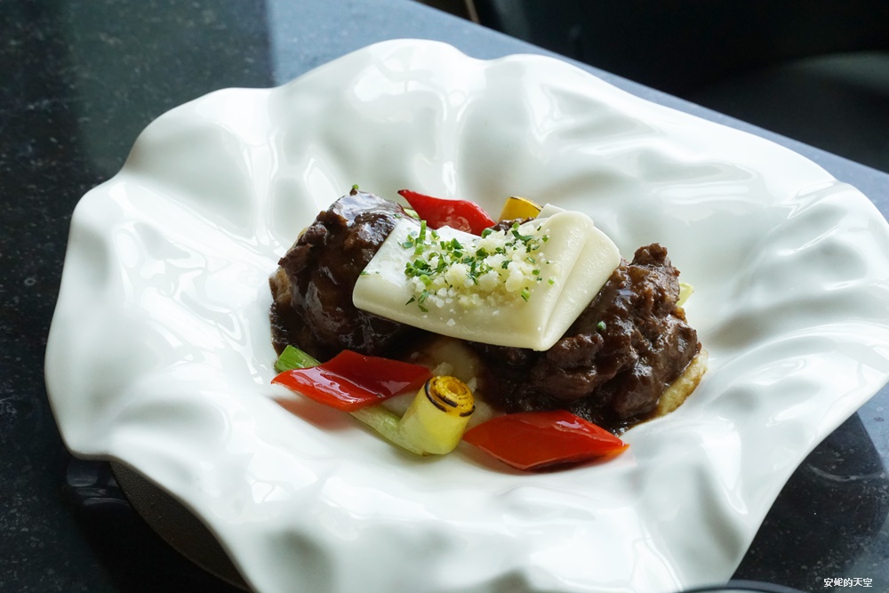 兩大塊紅酒燉豬頰肉佐上細緻的薯泥,再搭配Q彈的絲帕麵,點綴蘆筍、紅椒鮮蔬,盛裝再如花朵般造型的白色瓷盤哩,擺盤優雅,非常有質感。
