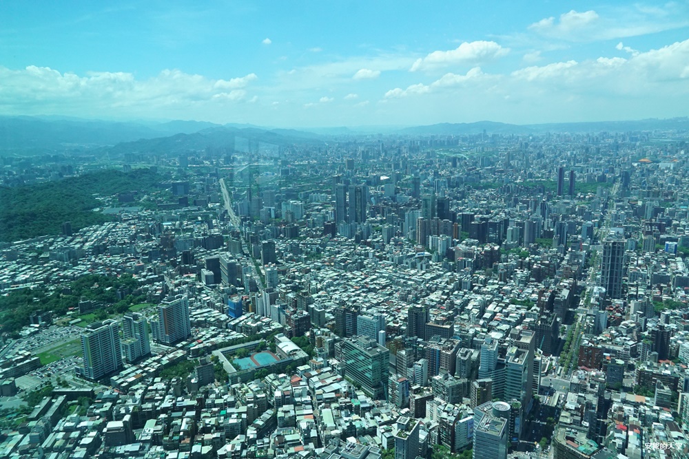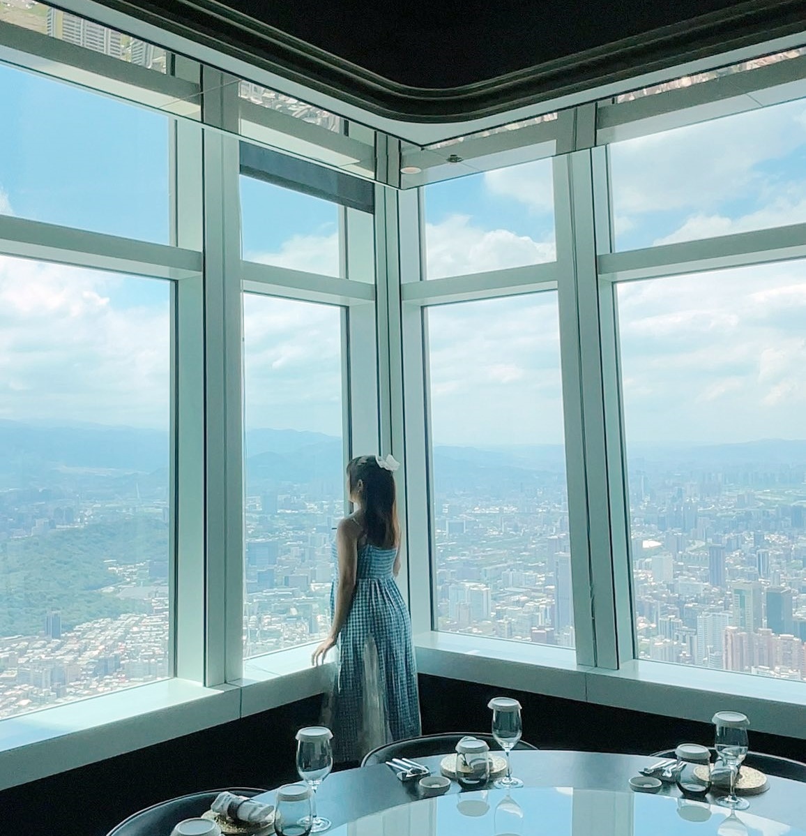 站在緊鄰玻璃帷幕的座位旁,真的會感受到一種居高臨下的震撼感,彷彿整座城市都鋪展在腳下。遠眺望去,景觀遼闊無邊,白天的陽光灑落在建築與街道之間,勾勒出台北最壯闊的城市線條。