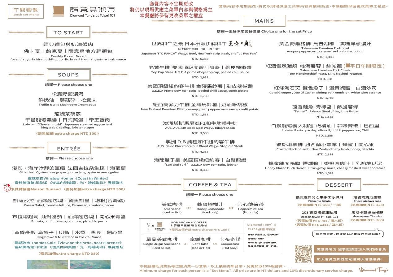 【隨意鳥地方】主打精緻排餐料理,無論是想體驗頂級奢華,還是輕鬆享受高空美食,都能在這裡找到適合自己的選擇。午間套餐價位從 $988 至 $4388 不等,選項多元,讓人可以依照預算與喜好自由搭配。