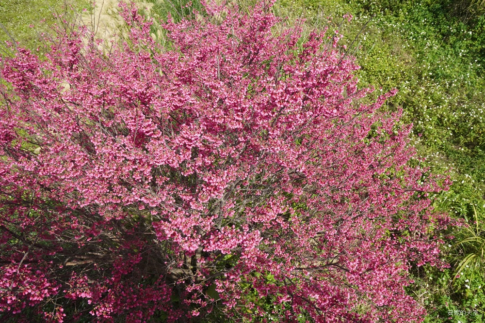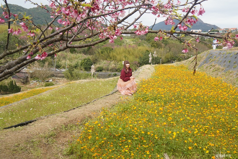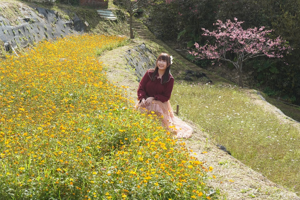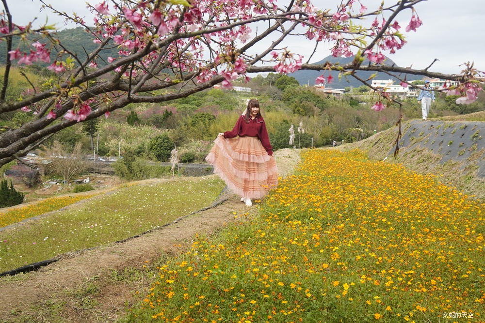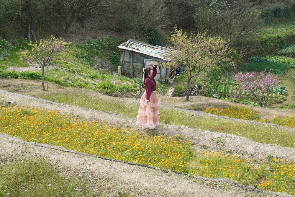 這一季的波斯菊實在太美了,沿著梯田恣意漫開,從不同角度望去,都展現出各自迷人的風貌。當波斯菊與櫻花相互映襯,粉嫩色調在山坡間層層疊加,彷彿替春日的景色再次加深筆觸,讓整片梯田更顯柔和而動人。