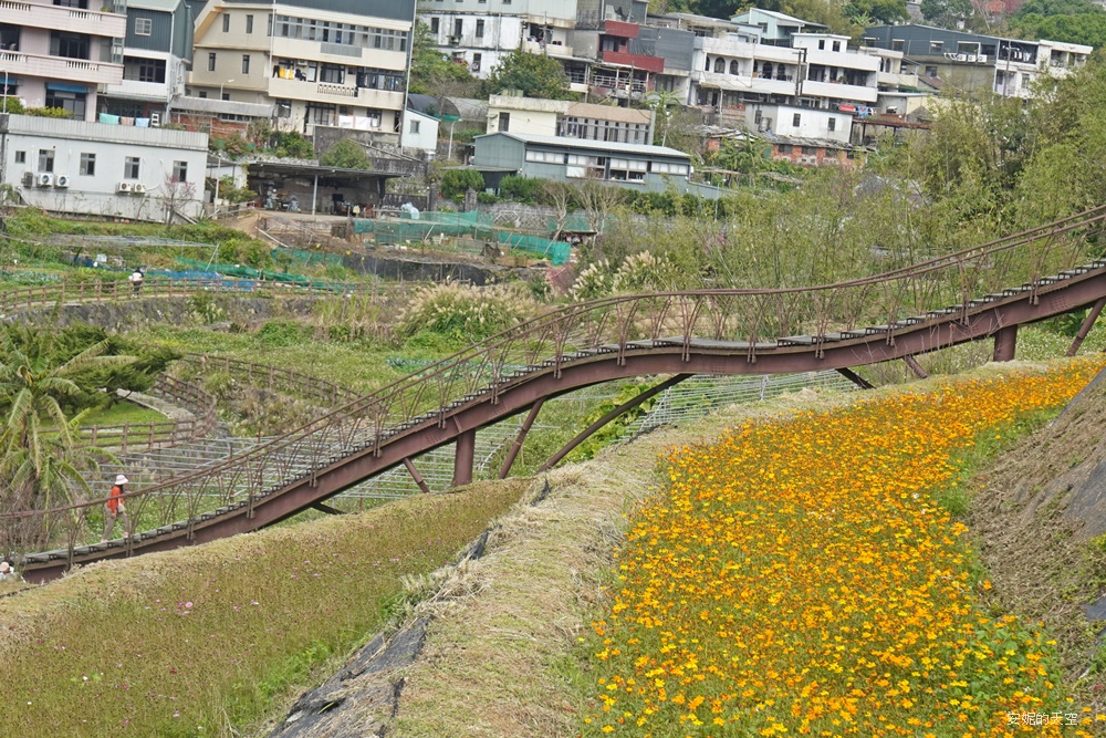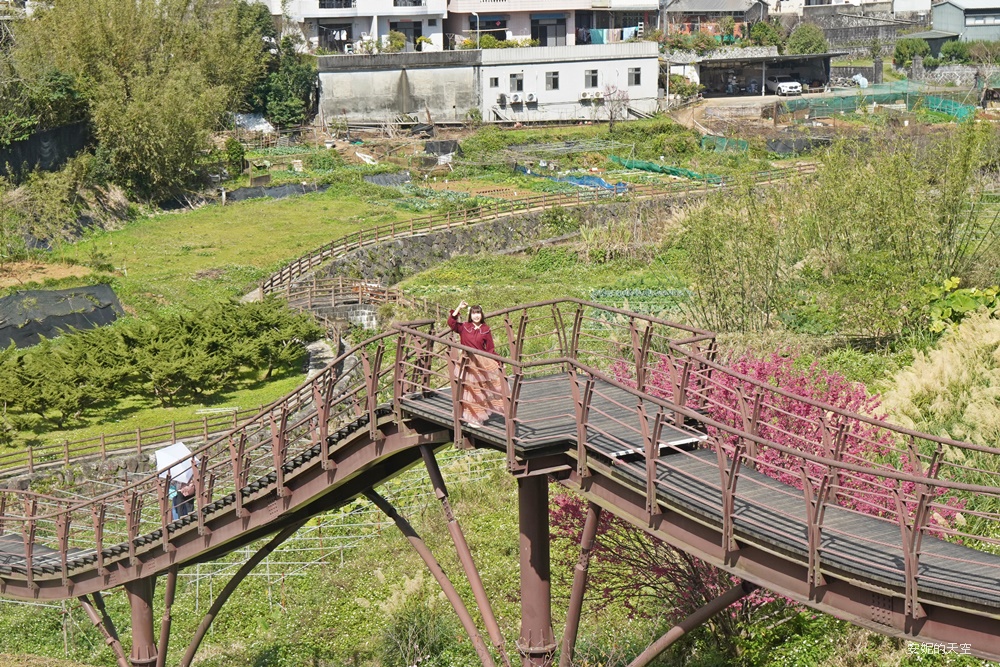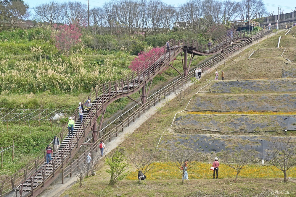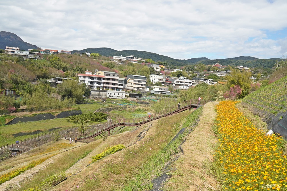 沒想到陽明山竟然藏著這樣一座絕美梯田。蜿蜒的浪棧道宛如稻浪的波紋,以優雅的弧線鋪展在山坡之間。層層疊疊的梯田向遠方延伸,一畝又一畝的花卉恣意盛放,彷彿把春天的粉彩色調全都傾倒進這片山坡,讓人有種走進粉彩畫作裡的錯覺。