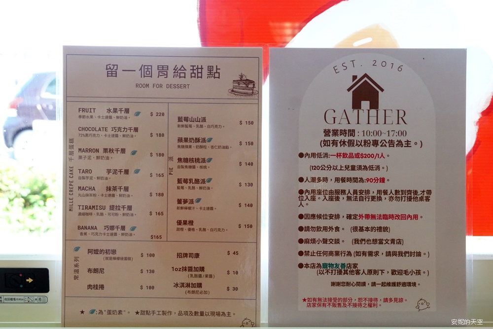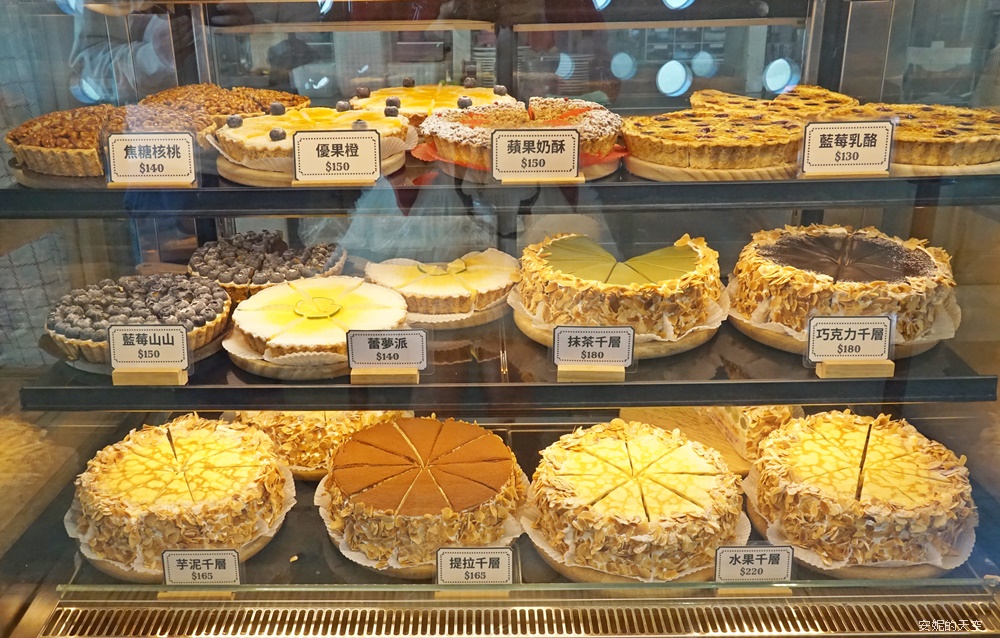 甜點櫃擺滿滿滿的甜點,上層是塔類的甜點,下面以千層蛋糕為主,仔細看這樣的價格,單價其實不貴,因為這裡的甜點個頭都很大,但我跟你們說,建議每個人點一顆蛋糕,這裡的甜點一個人獨食才滿足啊。