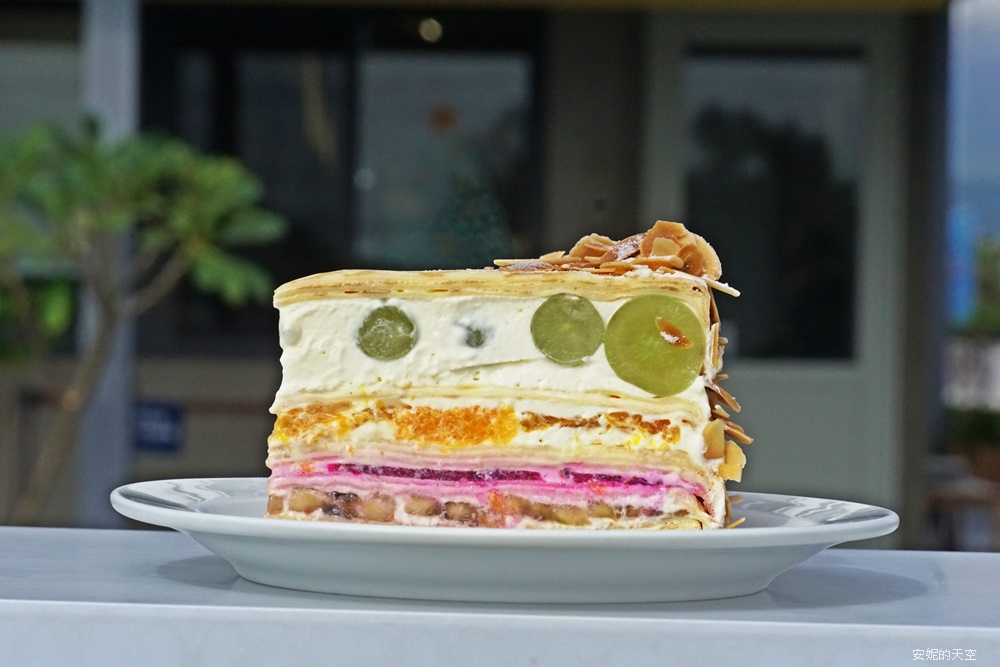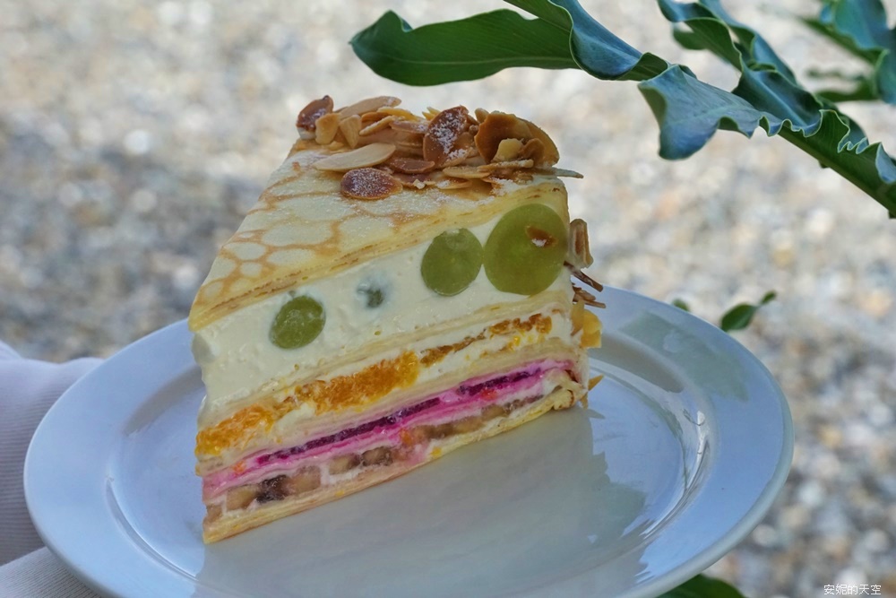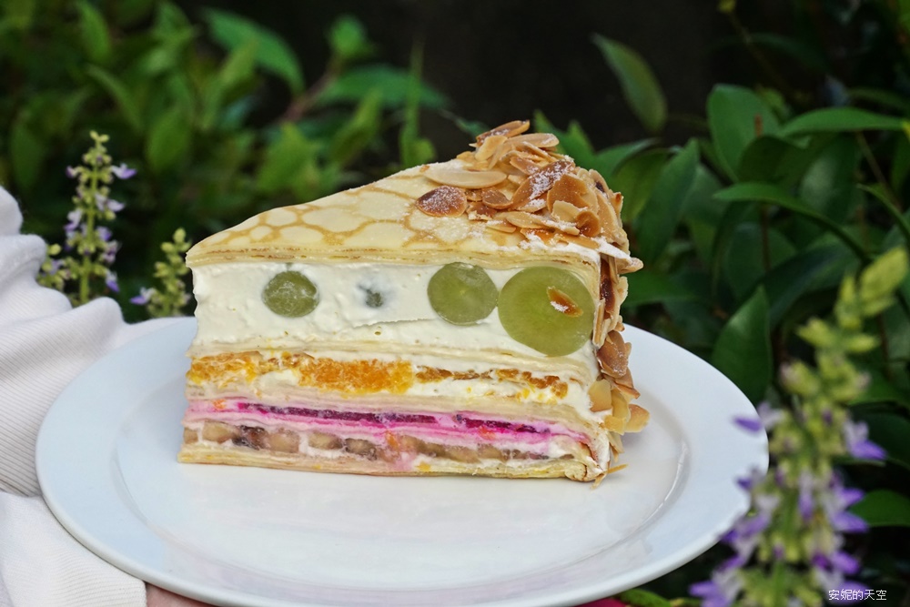 千層蛋糕上面還點綴著滿滿的杏仁片,讓口感又多了一個脆口層次與香氣,與細緻的蛋皮交融,越吃越涮口耶,裡頭的水果也都相當飽滿,但部會有過多水分影響蛋糕的口感,整個水果與奶油結合相得益彰,每一口都是幸福滋味。