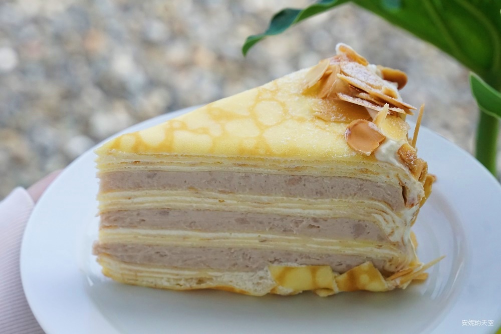 芋頭控這塊千層你一定要收,千層裡交織著厚實的芋泥,選用大甲芋頭,店家自製的芋泥裡還有芋頭塊,芋頭口感相當細緻,最厲害的是甜而不膩,原本以為芋頭吃多了會太膩口,結果完全不會,芋泥千層的奶油份量較輕盈,平衡的芋泥本身甜度,整體吃起來很綿密,有飽滿芋泥香,又有厚實的芋泥口感。