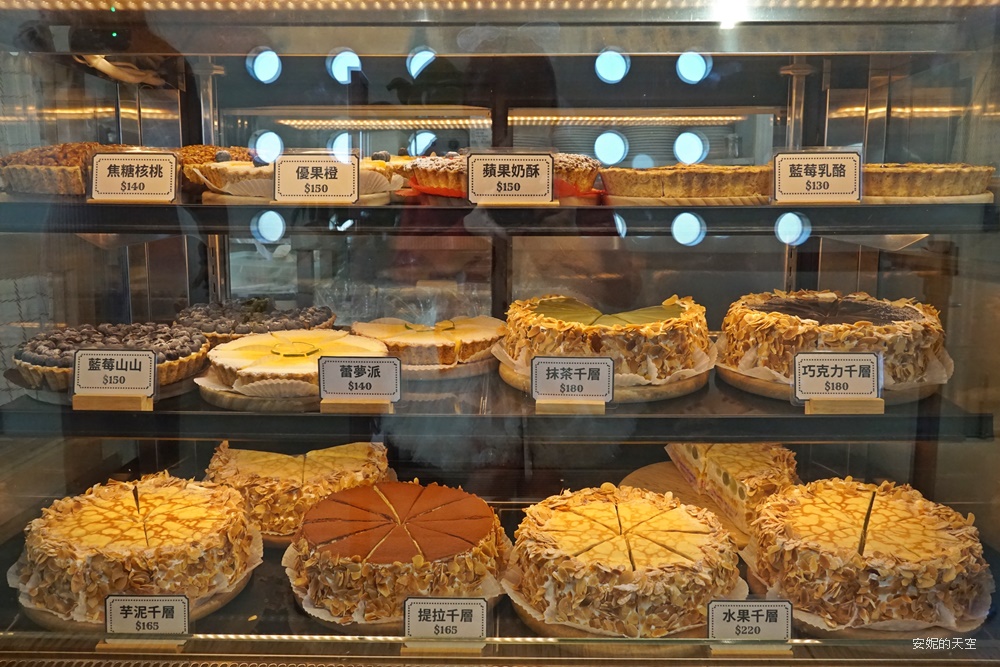 甜點櫃擺滿滿滿的甜點,上層是塔類的甜點,下面以千層蛋糕為主,仔細看這樣的價格,單價其實不貴,因為這裡的甜點個頭都很大,但我跟你們說,建議每個人點一顆蛋糕,這裡的甜點一個人獨食才滿足啊。