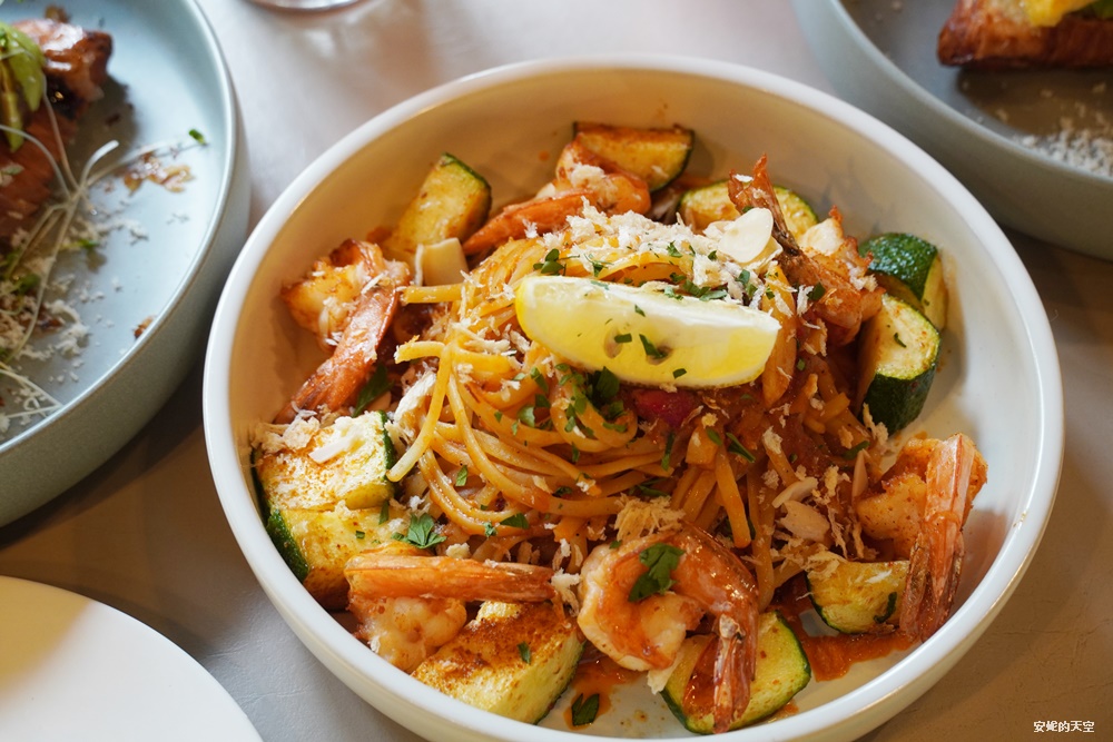義大利麵的配料給得很實在,鮮蝦與櫛瓜幾乎覆蓋整個盤面。味道偏清淡,調味不算突出,屬於穩定安全、不過重口的選擇。