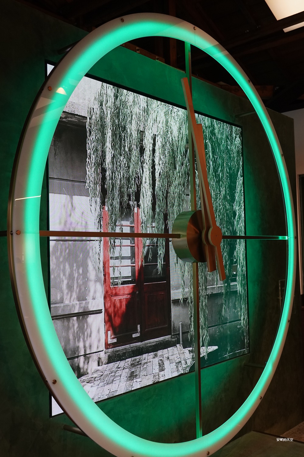 光一一個時間天花板保留原有建築的木頭支架,以及綠色窗框,保留老屋歷史元素的同時,以「時光之窗(A Window of Time)」為設計核心,光影可以流動在老宅的窗與空間之間,店內還有一座巨大的投影鐘墻,每輪會播放不同影像,是光一一個時間最吸睛的特色造景。