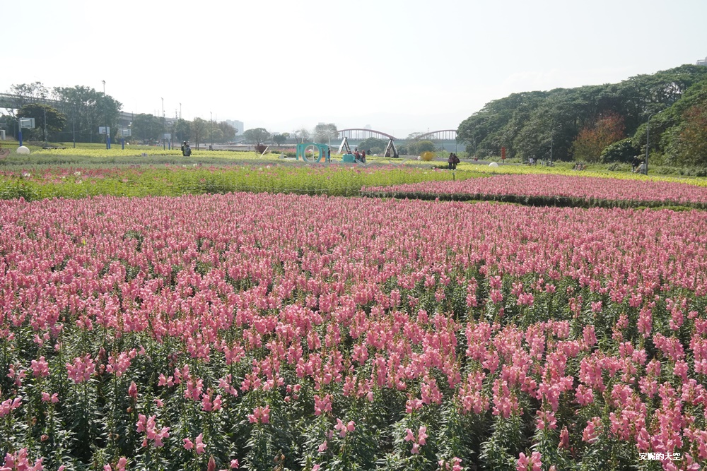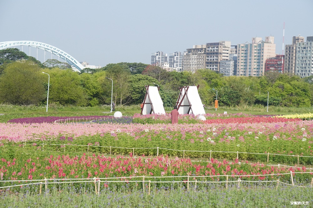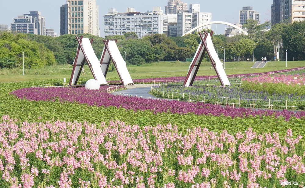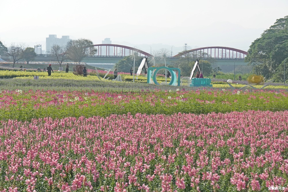 2026年的花海以粉彩色系為主調,淡雅的粉、純淨的白與柔和的紫,在河濱綠意間交織鋪展,營造出清新而溫柔的視覺層次。花海與橋墩結構相互映襯,再搭配園區內點綴的巨大裝置藝術,讓人漫步其中時,彷彿走進一頁童話繪本,夢幻氣息悄然流動。