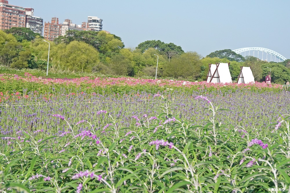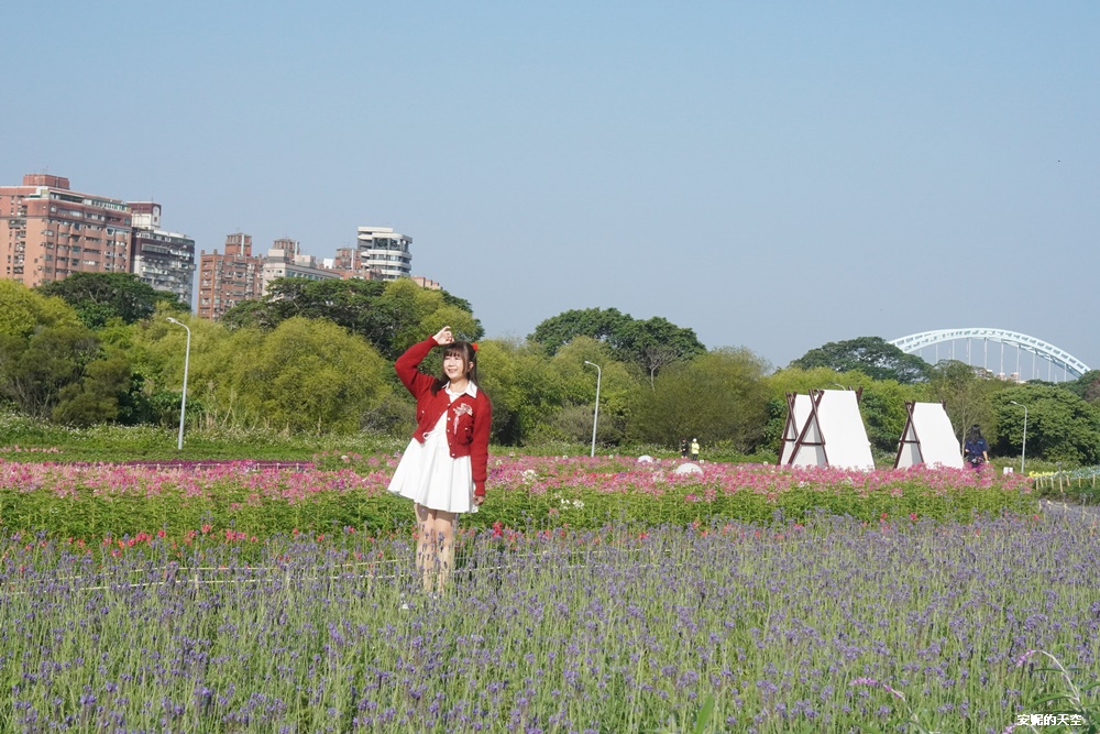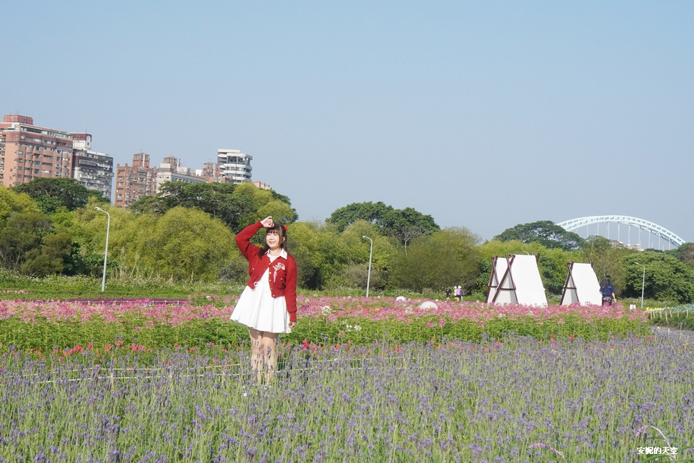 來到古亭河濱公園花海,一定要和整片花田同框入鏡。當人站在繽紛花海之中,被粉、白、紫色系層層包圍,那種畫面真的美得有些不真實,彷彿誤闖童話繪本場景。
