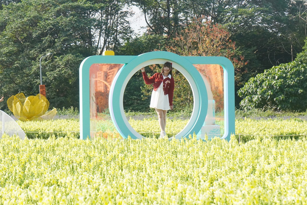 不少遊客走進花海,都會在巨型相機前駐足停留,拍下屬於自己的春日紀念。這樣的設計,彷彿也在回應大家來到這裡最喜歡做的事:按下快門,將最美好的瞬間定格收藏。