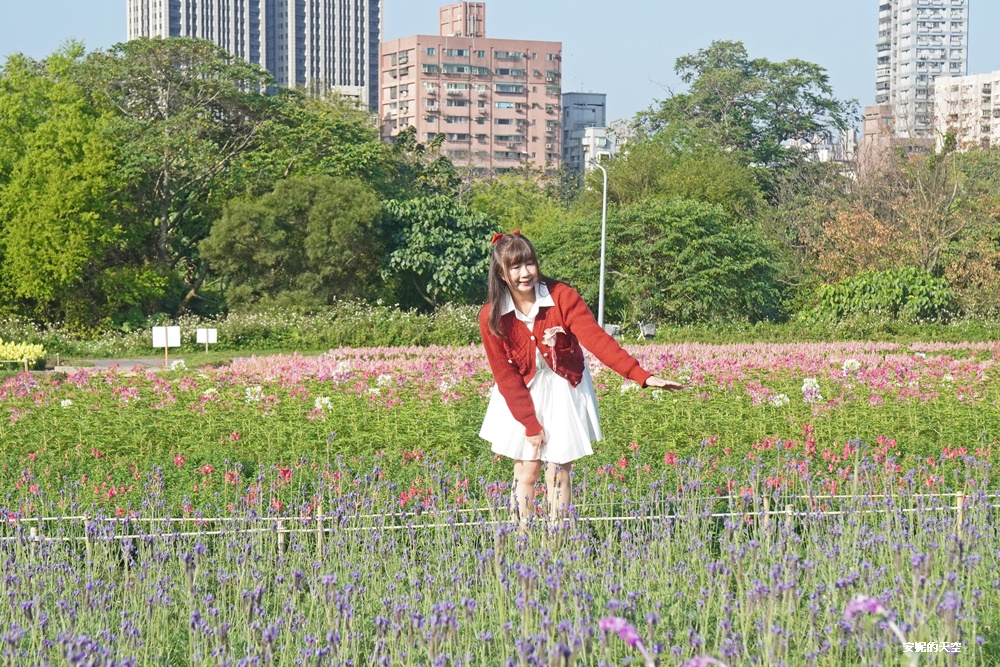 來到古亭河濱公園花海,一定要和整片花田同框入鏡。當人站在繽紛花海之中,被粉、白、紫色系層層包圍,那種畫面真的美得有些不真實,彷彿誤闖童話繪本場景。