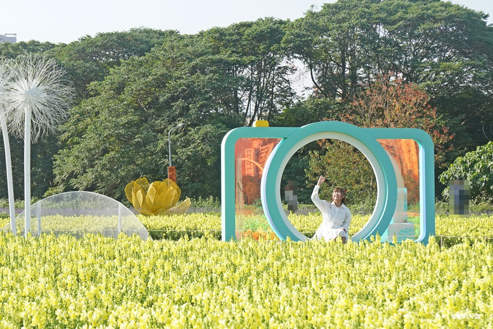 今年特別規劃大面積花田設計,巧妙融入吸睛的巨大相機裝置與童話風白色小屋,讓賞花多了幾分童趣與故事感。漫步其中,彷彿走進繪本場景,隨手一拍都是充滿想像力的畫面。