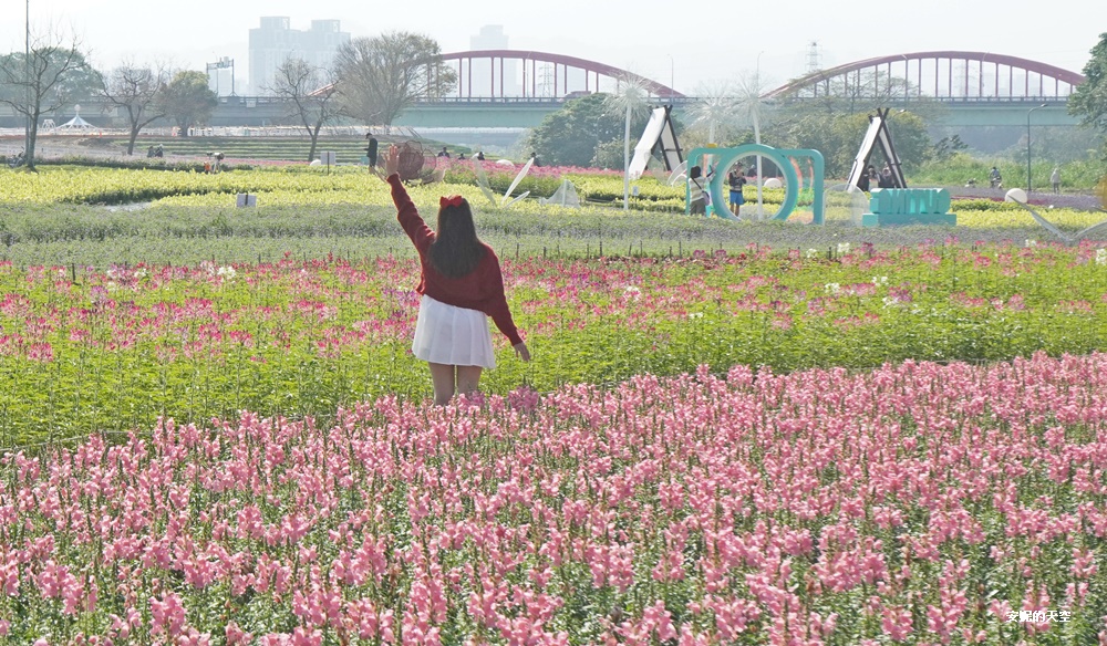 2026年的花海以粉彩色系為主調,淡雅的粉、純淨的白與柔和的紫,在河濱綠意間交織鋪展,營造出清新而溫柔的視覺層次。花海與橋墩結構相互映襯,再搭配園區內點綴的巨大裝置藝術,讓人漫步其中時,彷彿走進一頁童話繪本,夢幻氣息悄然流動。