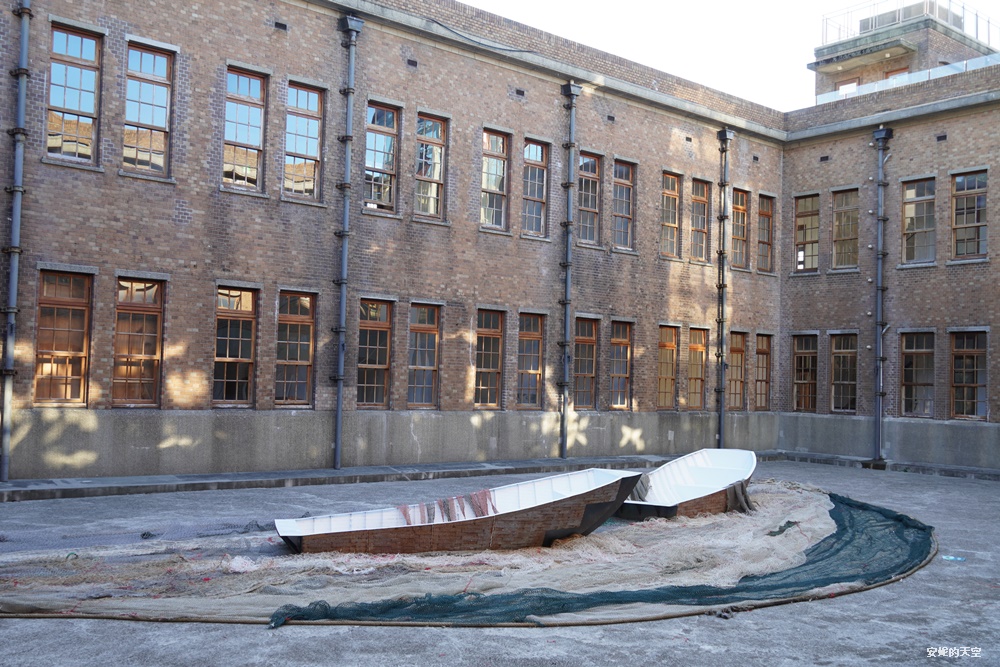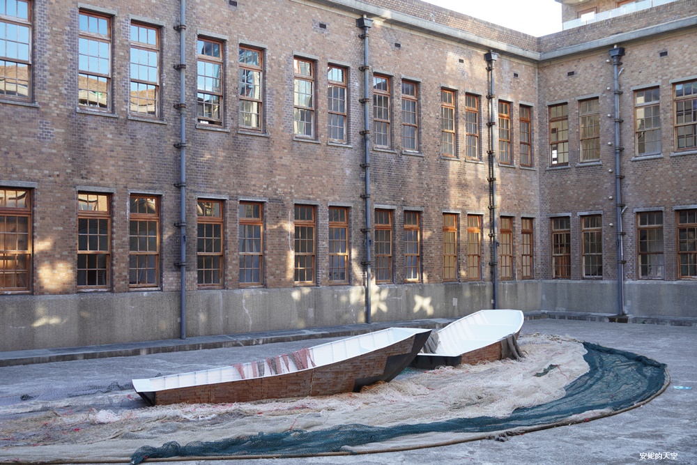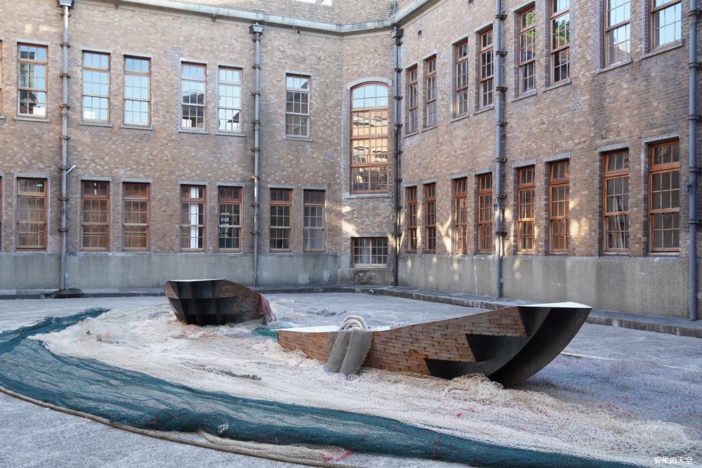 這件作品是由船隻與魚網構築而成,在紅磚建築與光影下格外有滄桑的感覺,特別的是船隻是可以登船上去拍攝的喔,原本以為這座藝術作品的意象在說明基隆海港故事,但翻了集章本發現,這件作品竟然是在講述基隆韓國人社區,自1945年大日本帝國戰敗後,隨著戰爭返回故鄉的韓國人,以及留下位登船的滯留者,在大歷史邊陲展開新的生活。