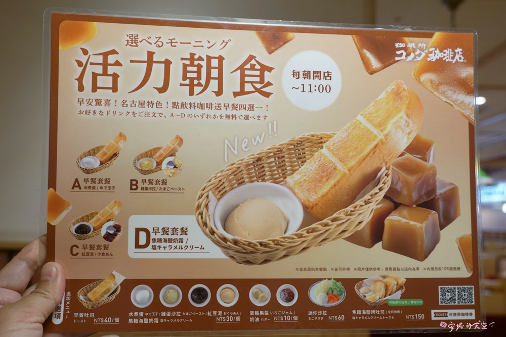 點飲料送早餐是客美多咖啡的經典,從早上7:30-11:00都有這項服務,早餐套餐共有四種選項,早餐套餐是日本特製吐司,分別搭配水煮蛋、雞蛋沙拉、紅豆泥以及限定口味(這一期是焦糖海鹽奶霜),如果想要加奶油、草莓果醬、生菜沙拉也可以另外加價購,點杯咖啡搭配吐司跟配料,可以吃飽又吃巧,是早餐人幸福的選擇。