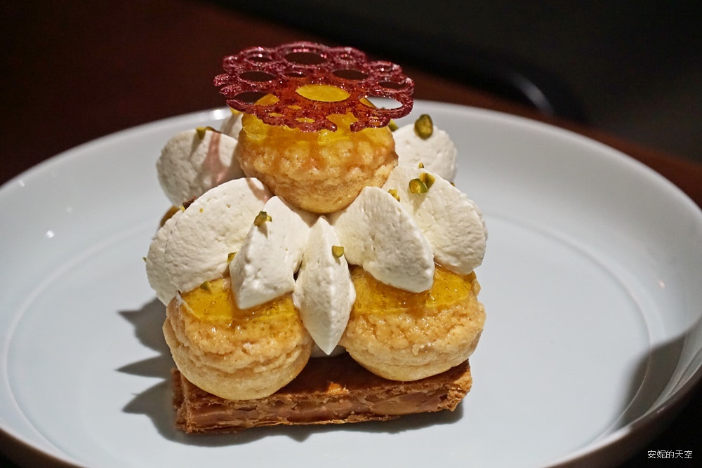 千層酥餅搭配四球開心果,特別的是用糖漿包裹,吃起來多一層脆口,開心果非常濃郁,香濃在嘴裡爆開,是這天我們三人一致最愛的甜點,多層次的擺盤與口感,視覺與口感都是享受。