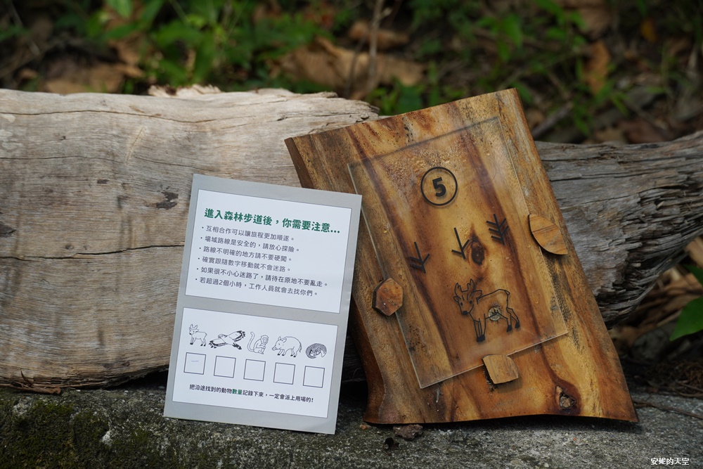 標示指隱藏在森林步道之間,除了有隱藏版的數字指引,還有動物的圖案,看到動物後大家可以在圖卡上作正字符號的紀錄,這些動物數量組合起來的數字,是這次旅程遊戲中,一個相當關鍵的過程,每次遇到動物圖卡都會好興奮,雖然不是什麼很困難的關卡,但在尋找中,會不自覺享受這個過程,完全沉浸在森林之間,也不會想要開啟網路,是徹底讓人遠離塵囂的森林旅程。