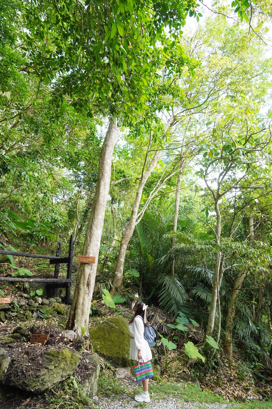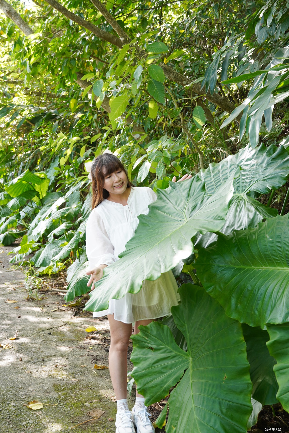 林間的植物蓬勃生長,姑婆芋葉片大得誇張,站在旁邊都覺得自己像童話裡的小人國旅人。
