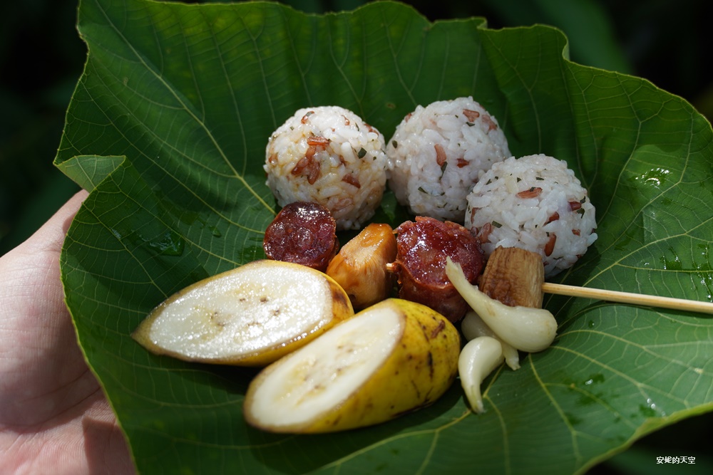 如果對部落美食仍意猶未盡,可以額外點一份部落午茶(費用 $150)。午茶包含三顆刺蔥飯糰、飛魚卵香腸與杏鮑菇串佐照燒醬,還有香甜的良心芭蕉與蕗蕎,每一口都延續了部落料理的用心與風味,是午後慢慢品味部落風情的最佳選擇。