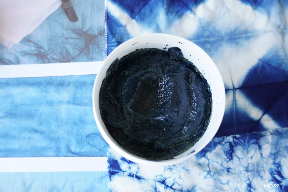 將折好的布放入染料中,仔細搓揉,讓藍色充分滲入纖維,浸泡一分鐘一分鐘後,再將布攤在陽光下,讓染劑在光影中慢慢氧化變色。重複五次,作品便大功告成。這一次,我才真正體會到陽光對藍染的重要性,它決定了每一片布料最終的深淺與韻味。
