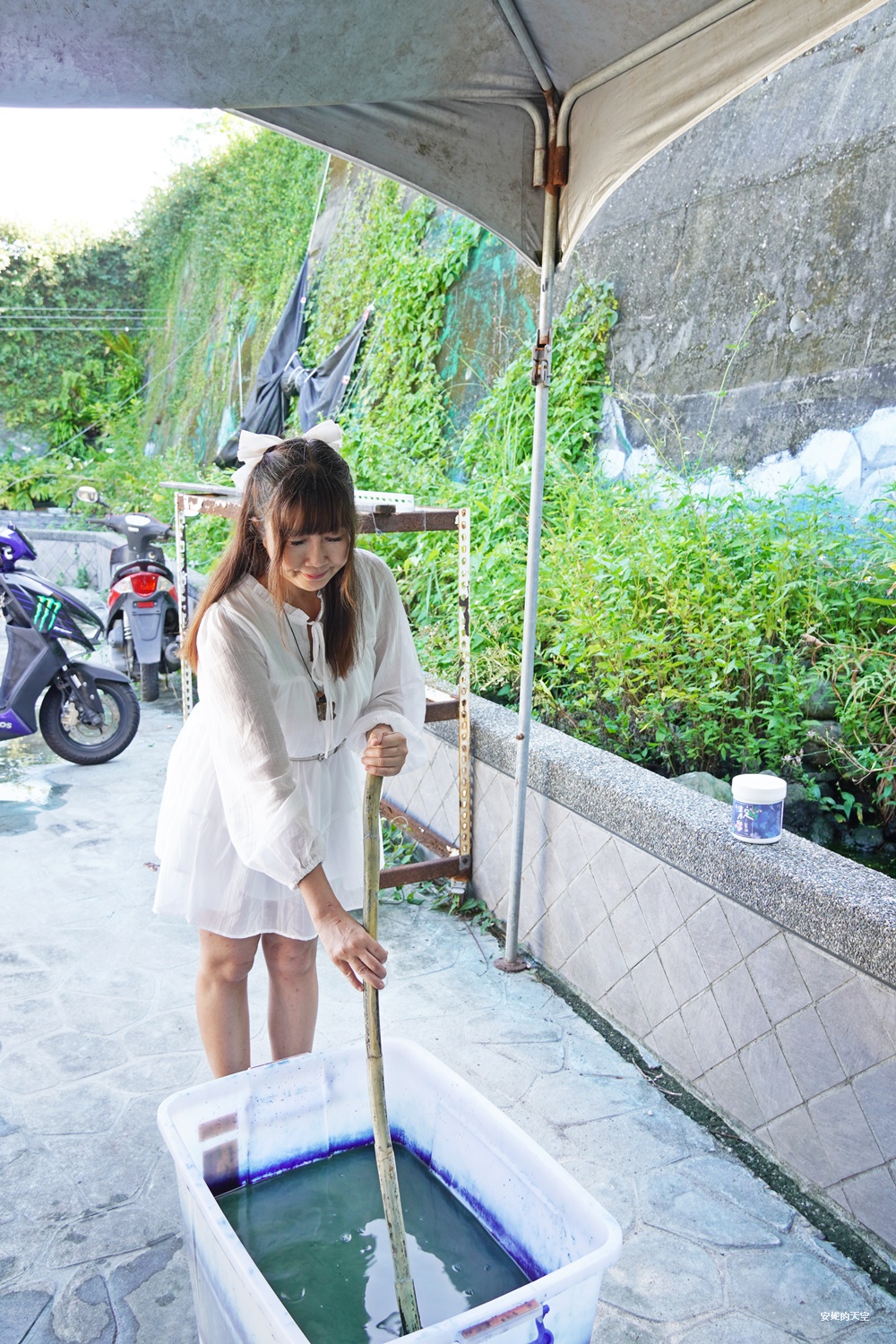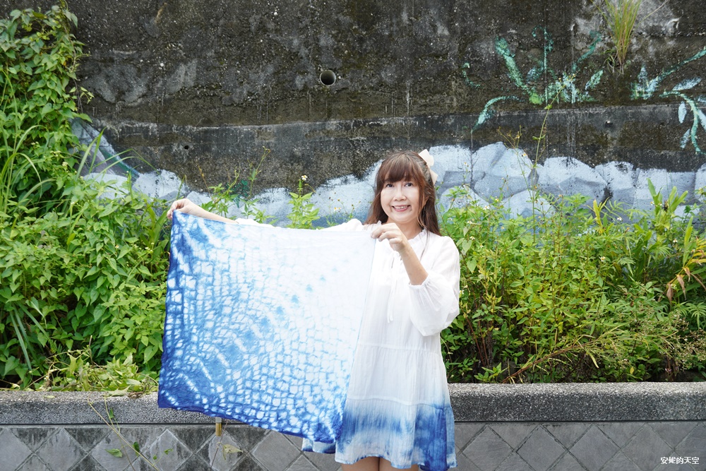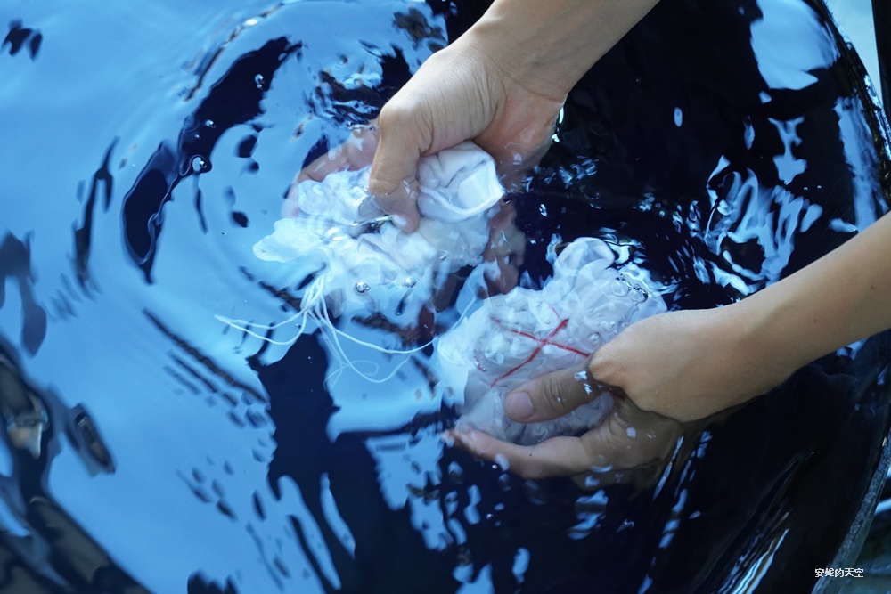 如果你自備白T,也可以親手體驗藍染自己的衣物。而這一次,我勇敢地拿出新買的白色洋裝,大膽嘗試在下擺染上深藍,讓洋裝瞬間變得與眾不同,充滿獨一無二的個性色彩。
