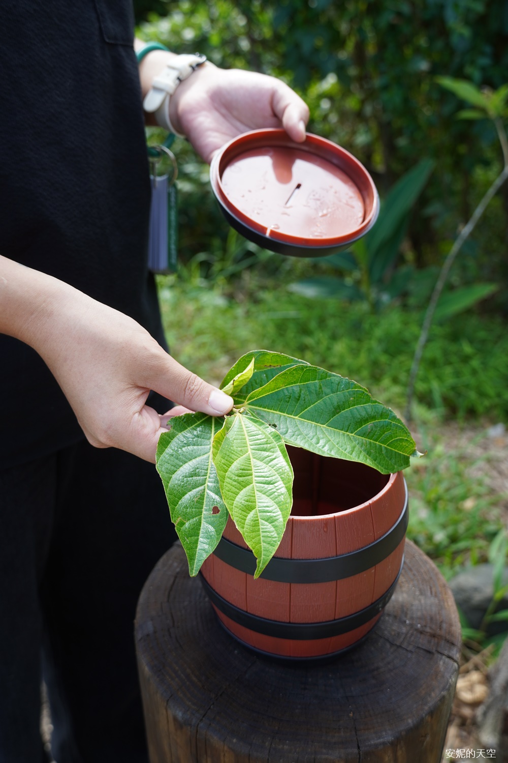 走著走著,森林間竟然藏著一個小小的「寶藏盒」。打開後,裡面藏著森林的秘密,一片澀葉榕的葉子。