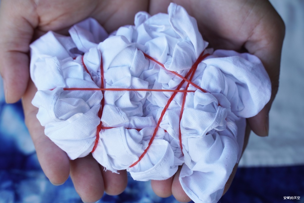 藍染的技巧多種多樣,這次老師教我們雲朵與海浪的摺染方法。將方巾用不同手法摺成一團,再用橡皮筋或棉線固定,每種摺法和綁法都會呈現不同的效果。最迷人的地方是:不到最後揭開布料前,永遠不知道會出現什麼樣的藍色圖案,充滿驚喜與期待。