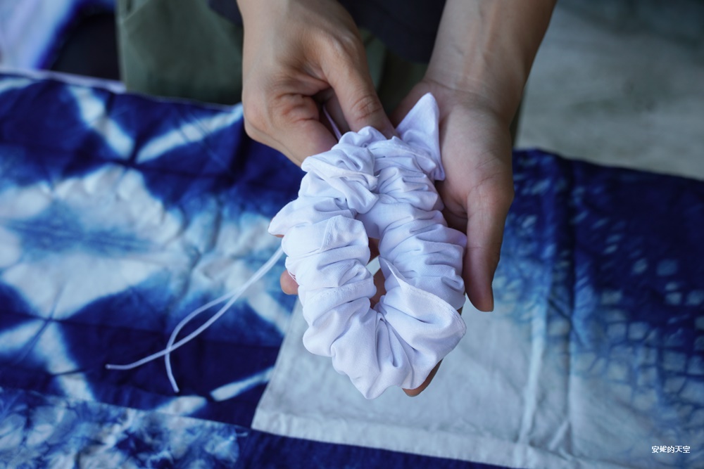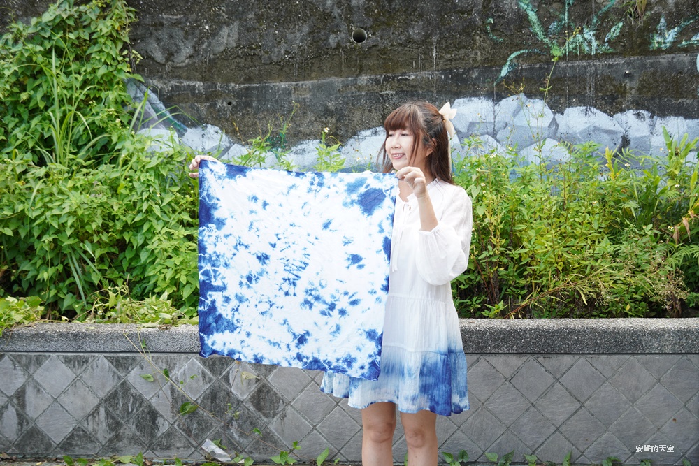 如果你自備白T,也可以親手體驗藍染自己的衣物。而這一次,我勇敢地拿出新買的白色洋裝,大膽嘗試在下擺染上深藍,讓洋裝瞬間變得與眾不同,充滿獨一無二的個性色彩。
