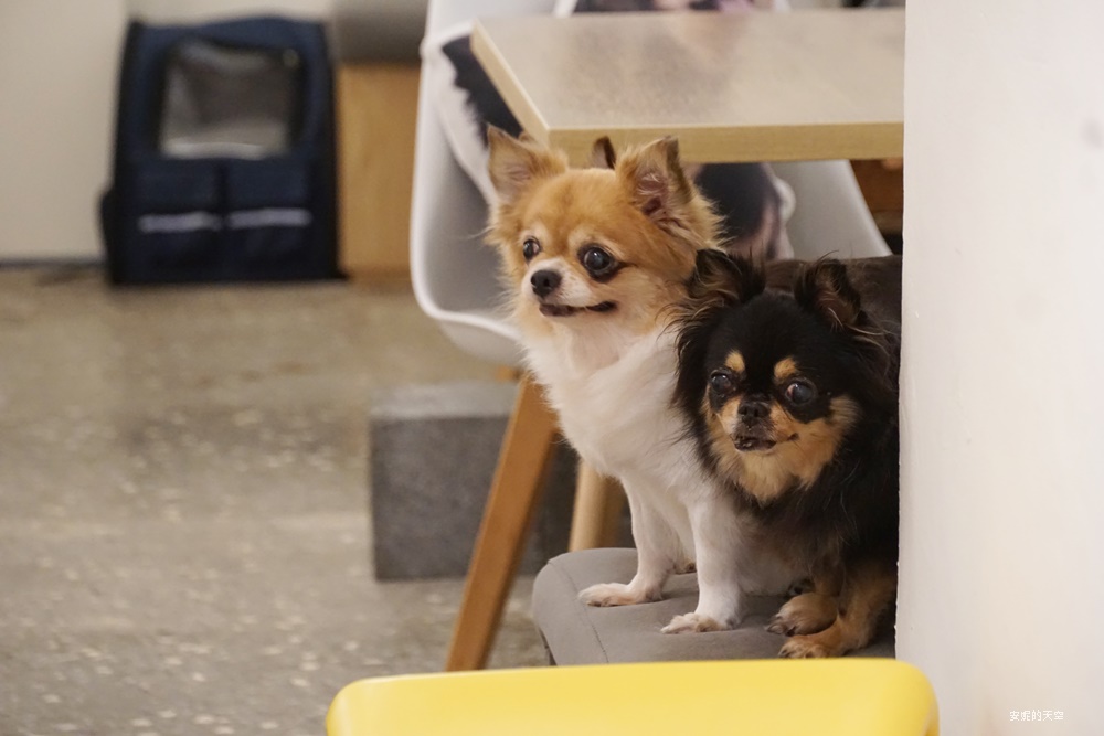妮妮、萌萌與貝貝是可愛的三隻店狗,除了四個月的貝貝稍微比較貪玩,妮妮、萌萌都非常有家教,不會隨便亂跑,喜歡親近人,但也會適時保持距離,我從來沒有看過一間寵物餐廳的店家寵物這麼乖巧與聽話,也不會影響自已帶來的毛小孩,在這裡可以很安心的與店狗互動,連我家膽小的貓貓在這裡也很安心的陪我用餐。