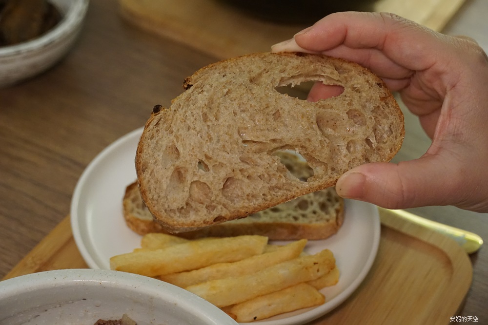 這裡的酸種麵包來自蘇澳手作麵包坊,以天然酵母製作,口感紮實又帶著迷人的嚼勁。搭配爽口的薯條,整體口感層次豐富,不僅美味,也非常有飽足感。